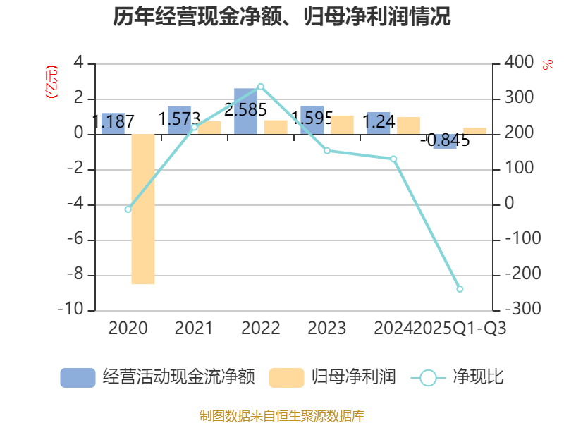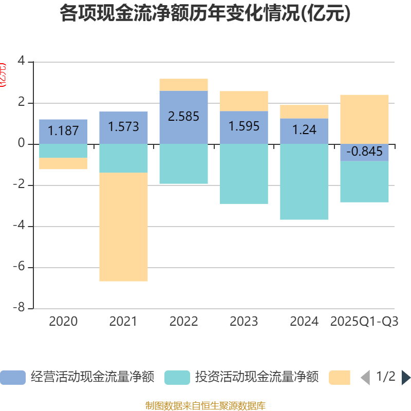2025年前三季度,公司经营活动现金流净额为-8453.35万元,同比增加1228.15万元;筹资活动现金流净额2.38亿元,同比增加2.04亿元;投资活动现金流净额-2亿元,上年同期为-2.19亿元。