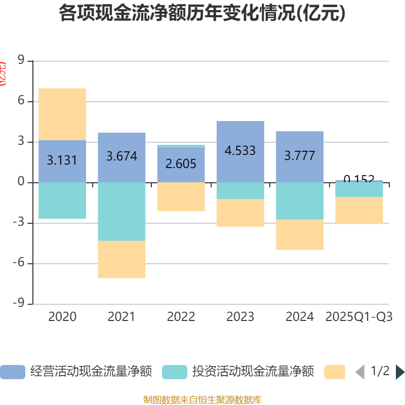 2025年前三季度,公司经营活动现金流净额为1520.41万元,同比下降65.34%;筹资活动现金流净额-1.99亿元,同比增加171.77万元;投资活动现金流净额-1.1亿元,上年同期为-1.92亿元。