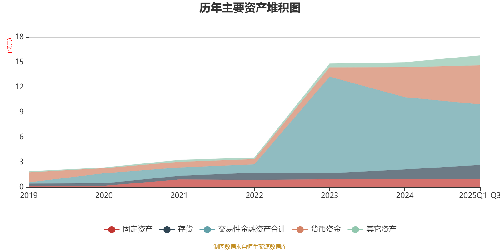 资产重大变化方面,截至2025年三季度末,公司交易性金融资产合计较上年末减少16.13%,占公司总资产比重下降11.86个百分点;货币资金较上年末增加30.2%,占公司总资产比重上升5.6个百分点;无形资产较上年末增加459.97%,占公司总资产比重上升3.57个百分点;存货较上年末增加47.79%,占公司总资产比重上升3.06个百分点。