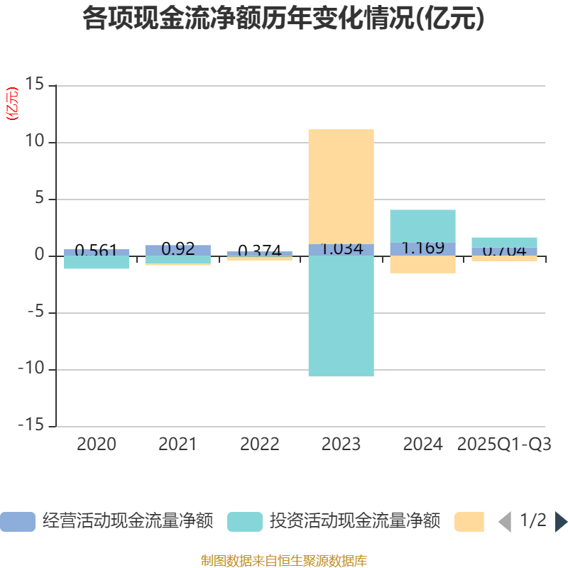 2025年前三季度,公司经营活动现金流净额为7036.59万元,同比增长44.29%;筹资活动现金流净额-4948.8万元,同比增加1.06亿元;投资活动现金流净额8825.38万元,上年同期为7.5亿元。