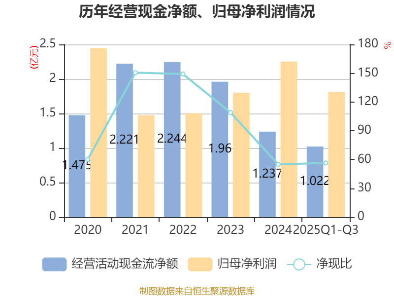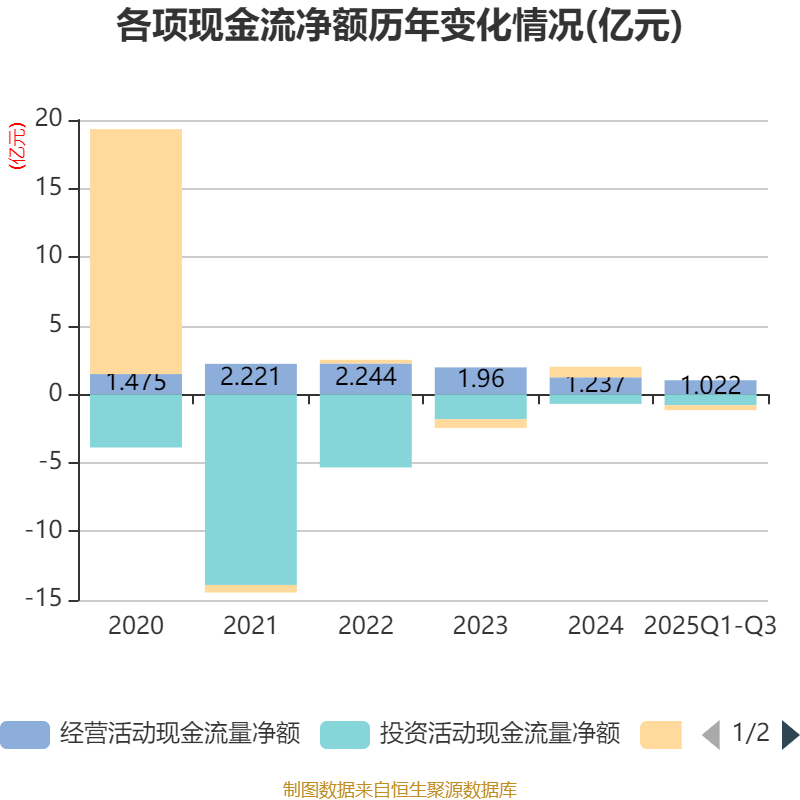 2025年前三季度,公司经营活动现金流净额为1.02亿元,同比下降35.55%;筹资活动现金流净额-3607.17万元,同比增加3552.35万元;投资活动现金流净额-7943.67万元,上年同期为5108.98万元。