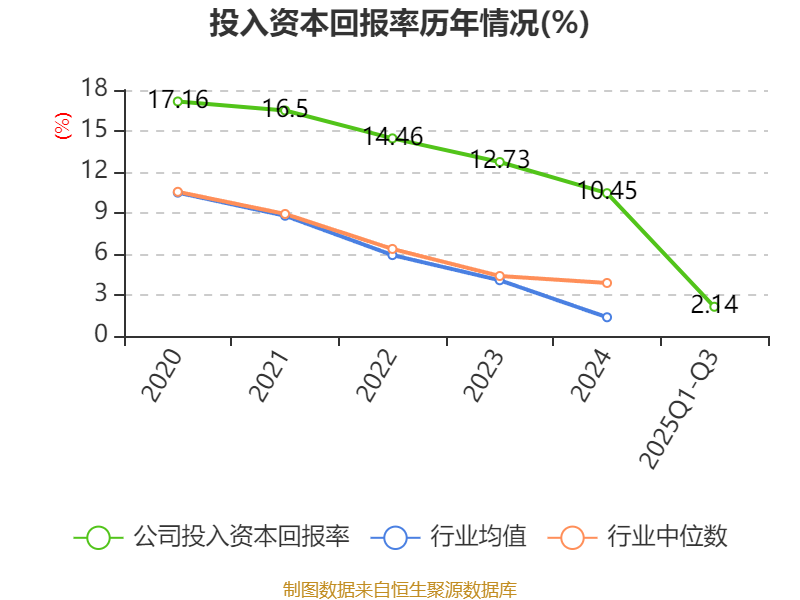 盈利能力方面, 2025年前三季度公司加权平均净资产收益率为2.39%,同比下降10.68个百分点。公司2025年前三季度投入资本回报率为2.14%,较上年同期下降7.65个百分点。
