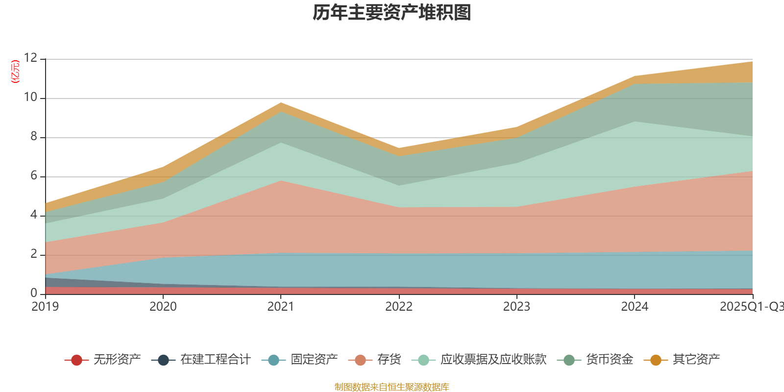 资产重大变化方面,截至2025年三季度末,公司应收票据及应收账款较上年末减少46.83%,占公司总资产比重下降15个百分点;货币资金较上年末增加43.52%,占公司总资产比重上升5.96个百分点;存货较上年末增加21.85%,占公司总资产比重上升4.27个百分点;预付款项较上年末增加184.86%,占公司总资产比重上升2.04个百分点。
