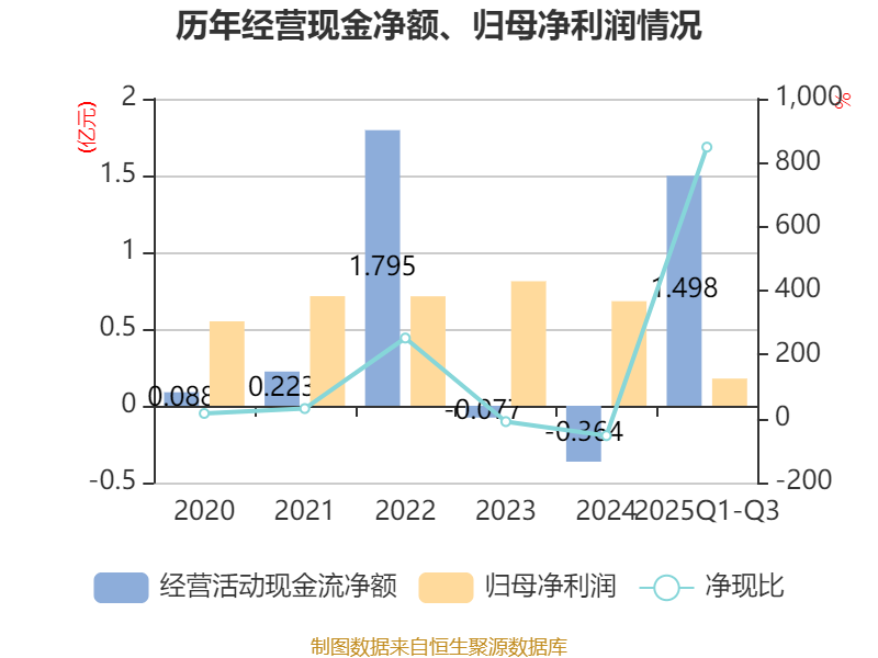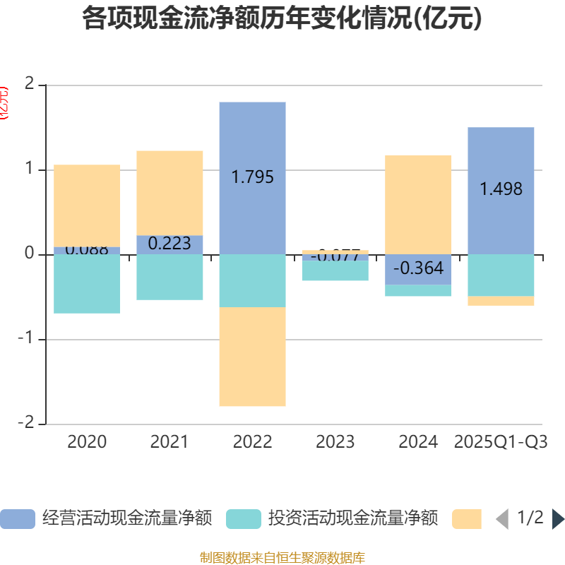 2025年前三季度,公司经营活动现金流净额为1.5亿元,同比增加1.93亿元;筹资活动现金流净额-1097.25万元,同比减少1.48亿元;投资活动现金流净额-4966.26万元,上年同期为-2314.57万元。