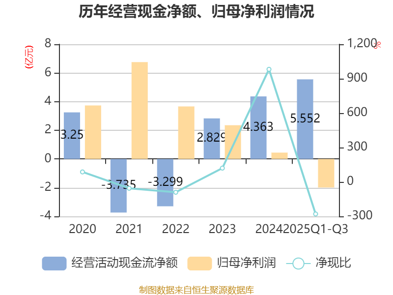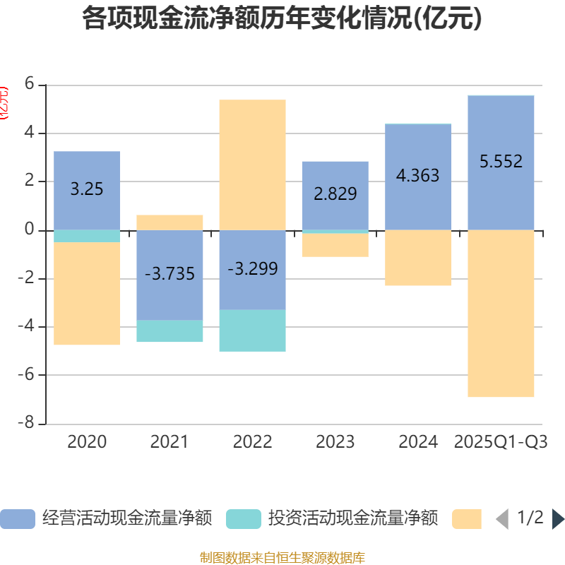 2025年前三季度,公司经营活动现金流净额为5.55亿元,同比增加9.48亿元;筹资活动现金流净额-6.9亿元,同比减少8.62亿元;投资活动现金流净额148.22万元,上年同期为80.28万元。