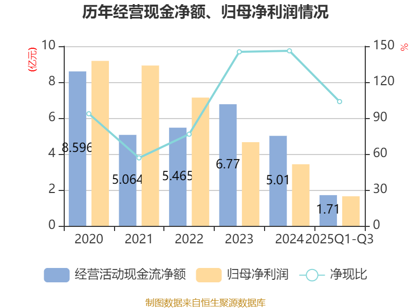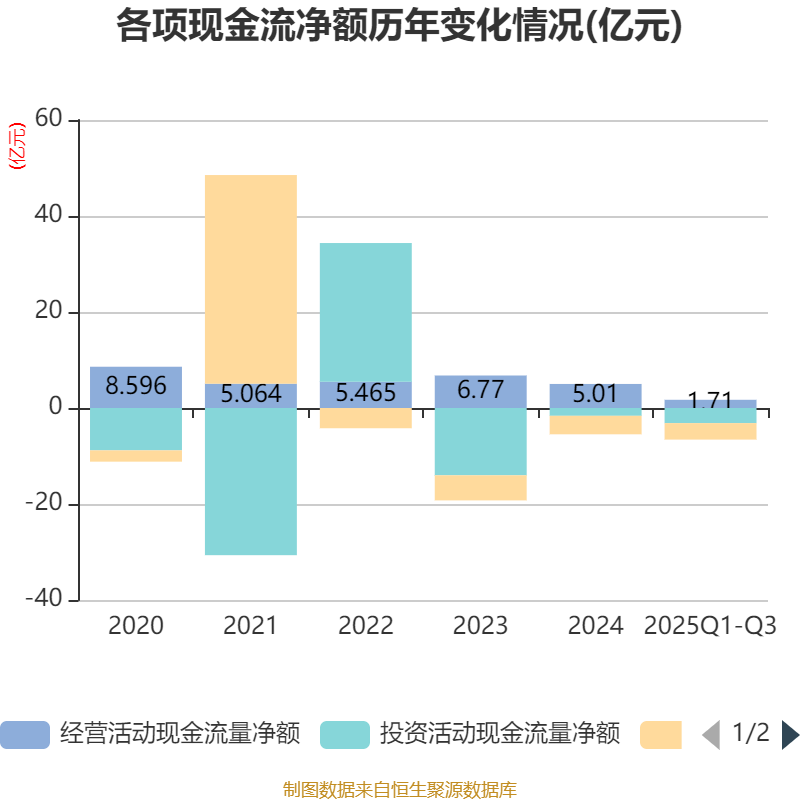 2025年前三季度,公司经营活动现金流净额为1.71亿元,同比下降41.27%;筹资活动现金流净额-3.43亿元,同比增加3930.13万元;投资活动现金流净额-3.15亿元,上年同期为-1.92亿元。