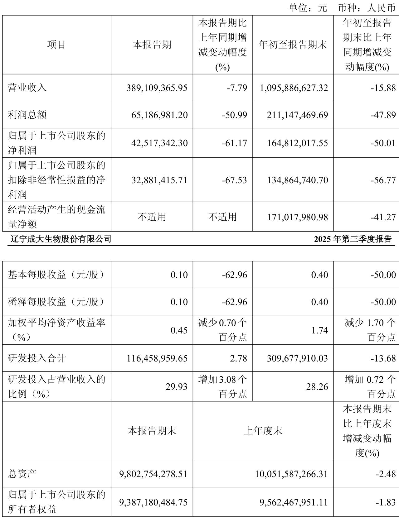 中证智能财讯成大生物(688739)10月30日披露2025年第三季度报告。前三季度公司实现营业总收入10.96亿元,同比下降15.88%;归母净利润1.65亿元,同比下降50.01%;扣非净利润1.35亿元,同比下降56.77%;经营活动产生的现金流量净额为1.71亿元,同比下降41.27%;报告期内,成大生物基本每股收益为0.4元,加权平均净资产收益率为1.74%。