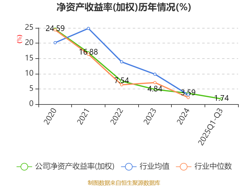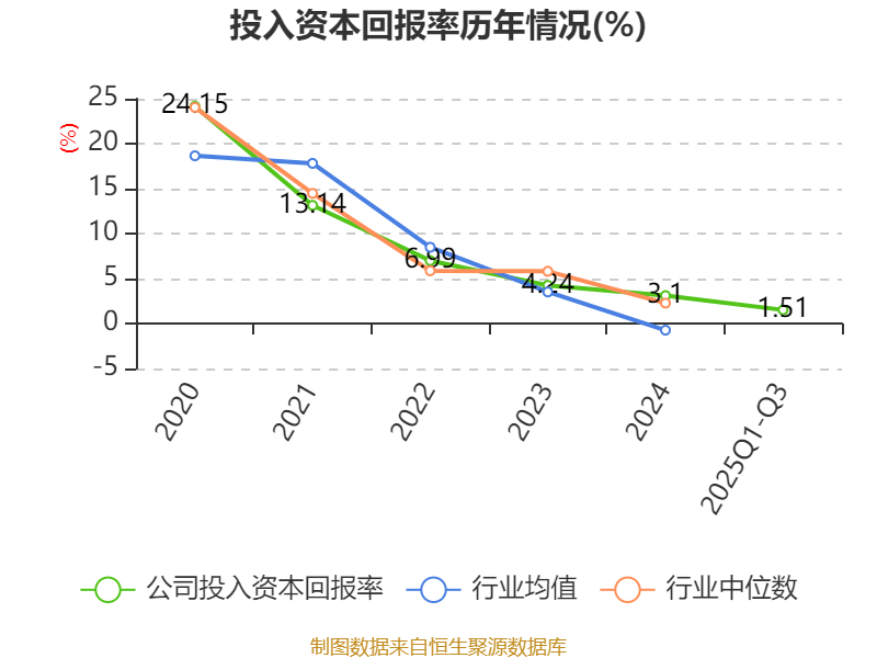 盈利能力方面, 2025年前三季度公司加权平均净资产收益率为1.74%,同比下降1.7个百分点。公司2025年前三季度投入资本回报率为1.51%,较上年同期下降1.58个百分点。