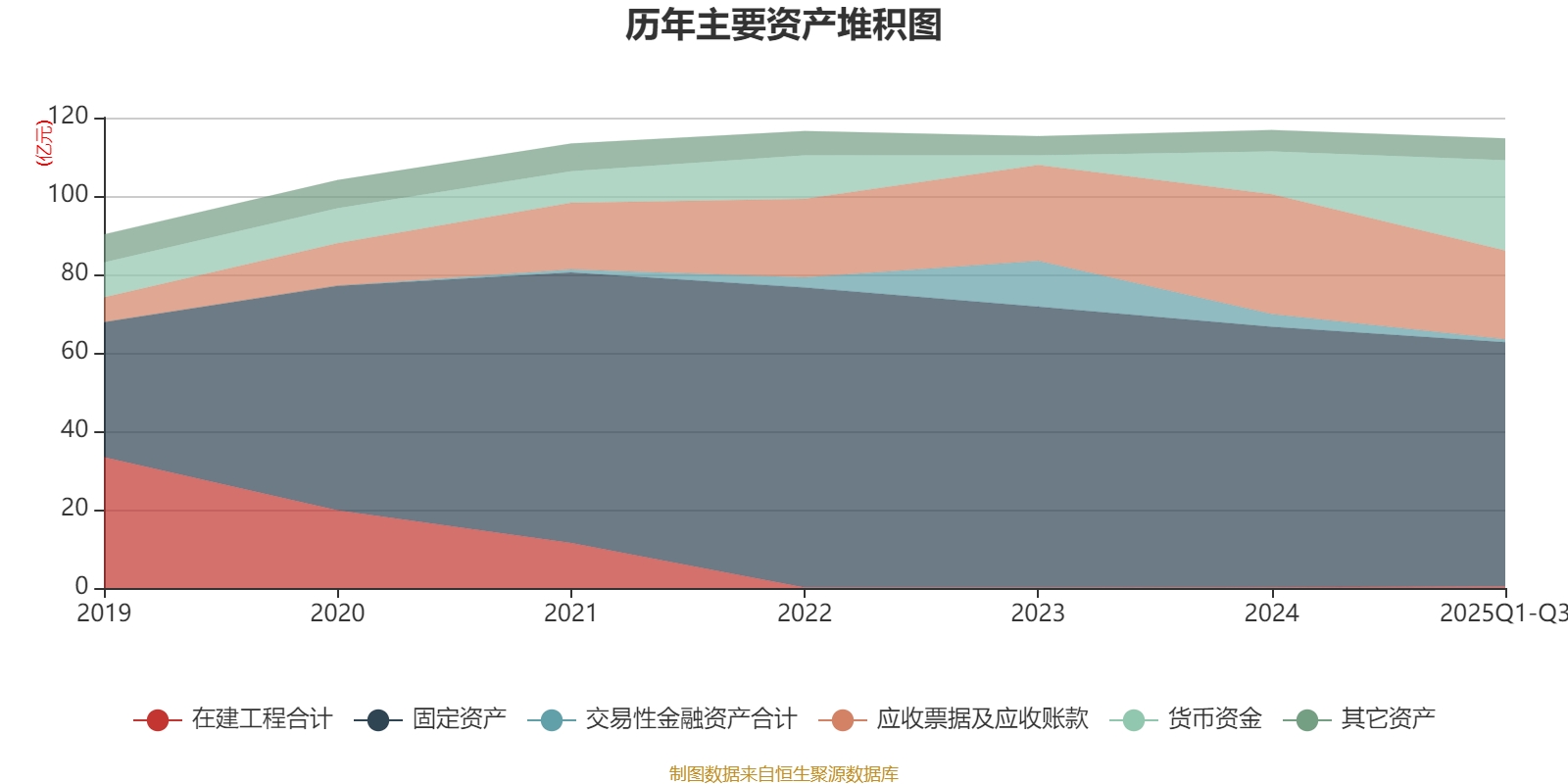 资产重大变化方面,截至2025年三季度末,公司货币资金较上年末增加110.58%,占公司总资产比重上升10.72个百分点;应收票据及应收账款较上年末减少25.95%,占公司总资产比重下降6.43个百分点;固定资产较上年末减少6.23%,占公司总资产比重下降2.54个百分点;交易性金融资产合计较上年末减少76.68%,占公司总资产比重下降2.13个百分点。