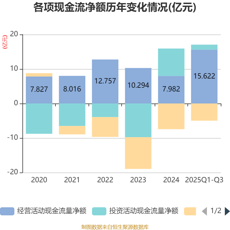 2025年前三季度,公司经营活动现金流净额为15.62亿元,同比增长196.5%;筹资活动现金流净额-4.98亿元,同比增加4708.71万元;投资活动现金流净额1.44亿元,上年同期为-3345.48万元。