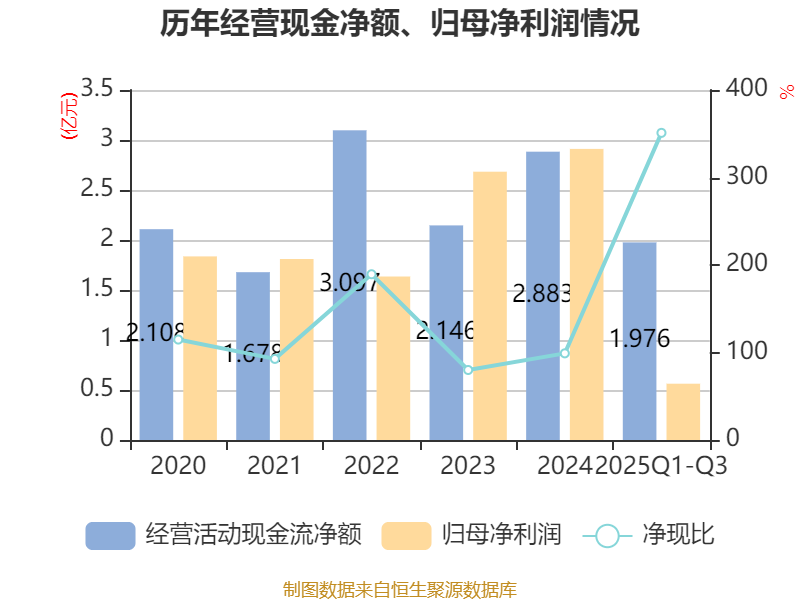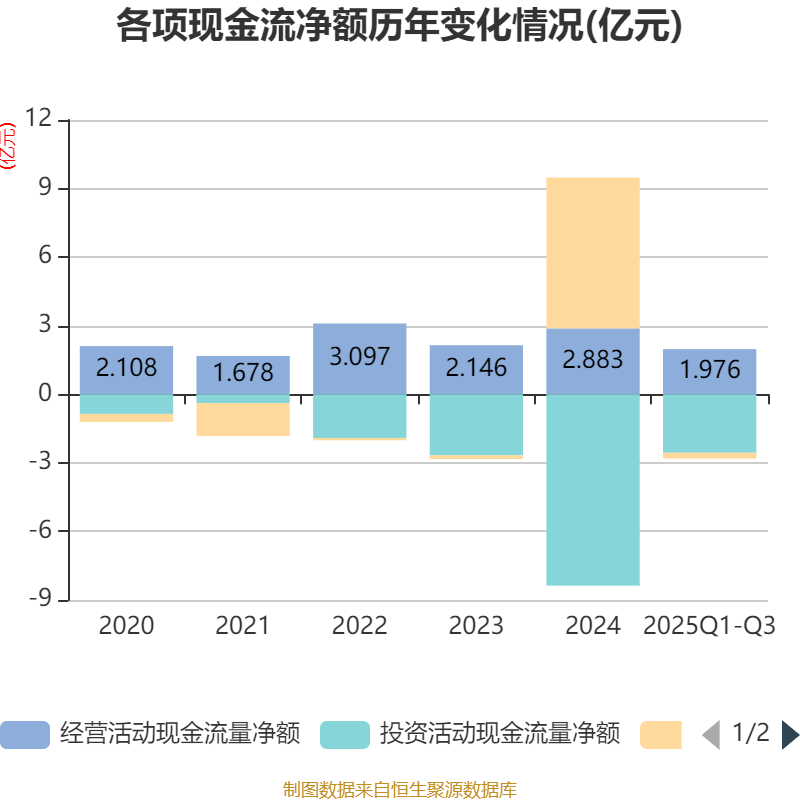 2025年前三季度,公司经营活动现金流净额为1.98亿元,同比下降7.39%;筹资活动现金流净额-2605.59万元,同比减少8.56亿元;投资活动现金流净额-2.56亿元,上年同期为-6.32亿元。