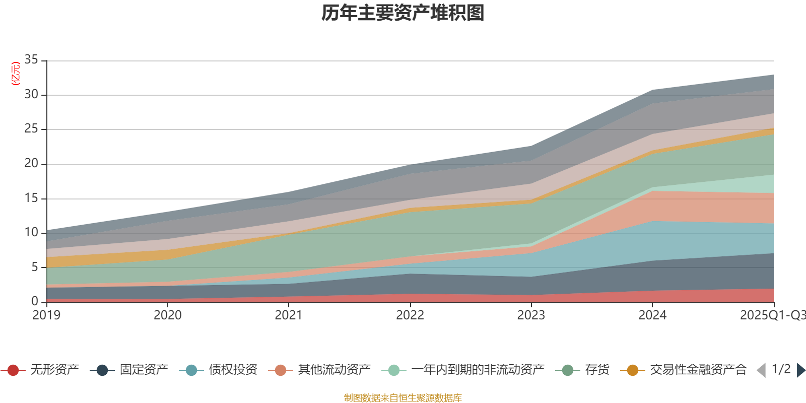 资产重大变化方面,截至2025年三季度末,公司一年内到期的非流动资产较上年末增加401.41%,占公司总资产比重上升6.37个百分点;债权投资较上年末减少24.67%,占公司总资产比重下降5.55个百分点;货币资金较上年末减少20.96%,占公司总资产比重下降3.77个百分点;存货较上年末增加21.02%,占公司总资产比重上升2.03个百分点。
