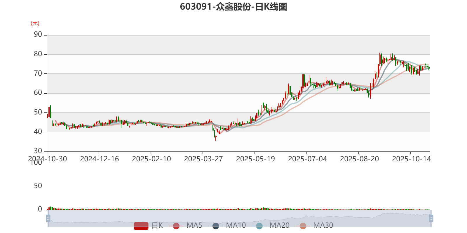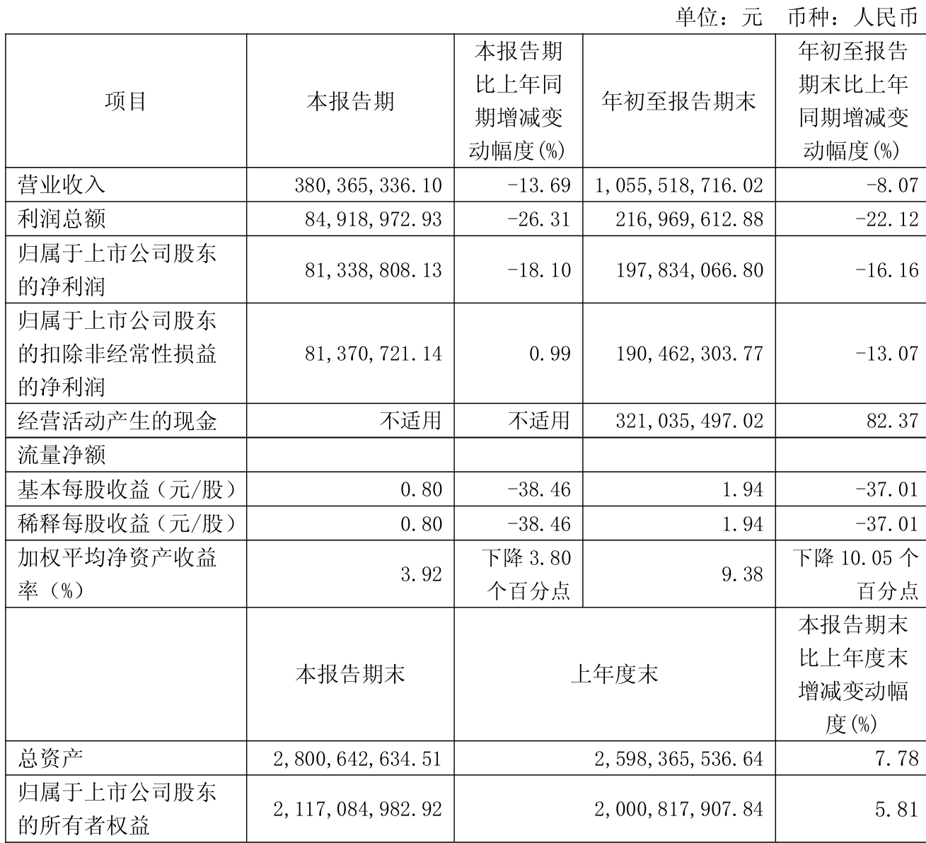 中证智能财讯众鑫股份(603091)10月30日披露2025年第三季度报告。前三季度公司实现营业总收入10.56亿元,同比下降8.07%;归母净利润1.98亿元,同比下降16.16%;扣非净利润1.9亿元,同比下降13.07%;经营活动产生的现金流量净额为3.21亿元,同比增长82.37%;报告期内,众鑫股份基本每股收益为1.94元,加权平均净资产收益率为9.38%。
