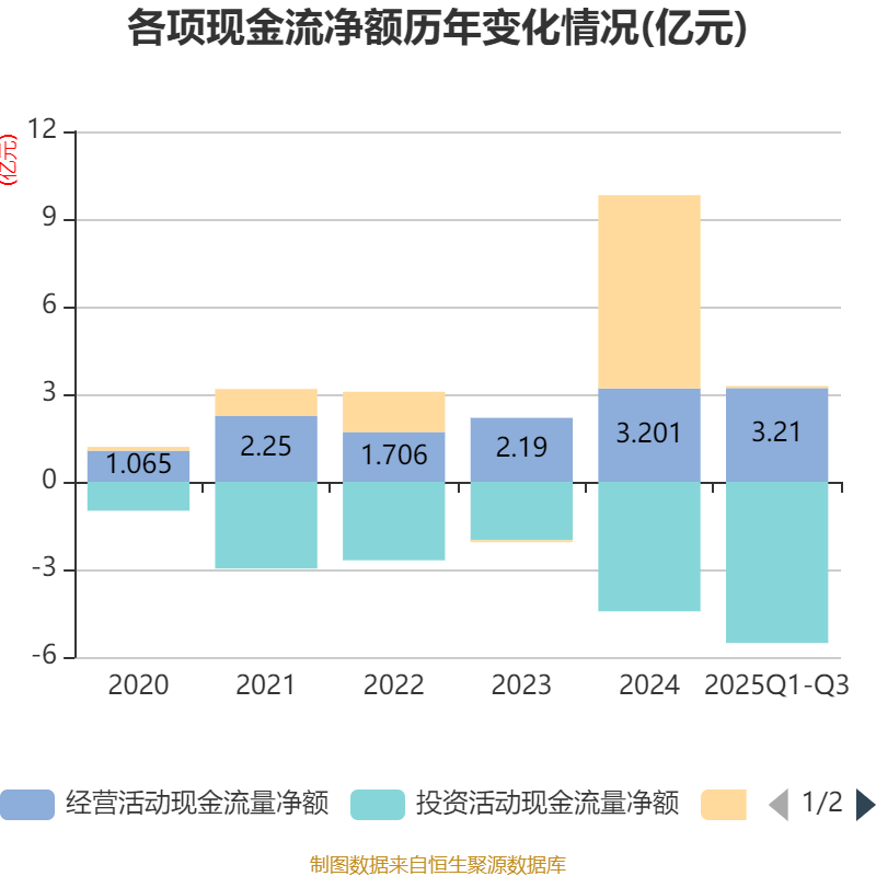 2025年前三季度,公司经营活动现金流净额为3.21亿元,同比增长82.37%;筹资活动现金流净额704.59万元,同比减少7.42亿元;投资活动现金流净额-5.52亿元,上年同期为-2.95亿元。