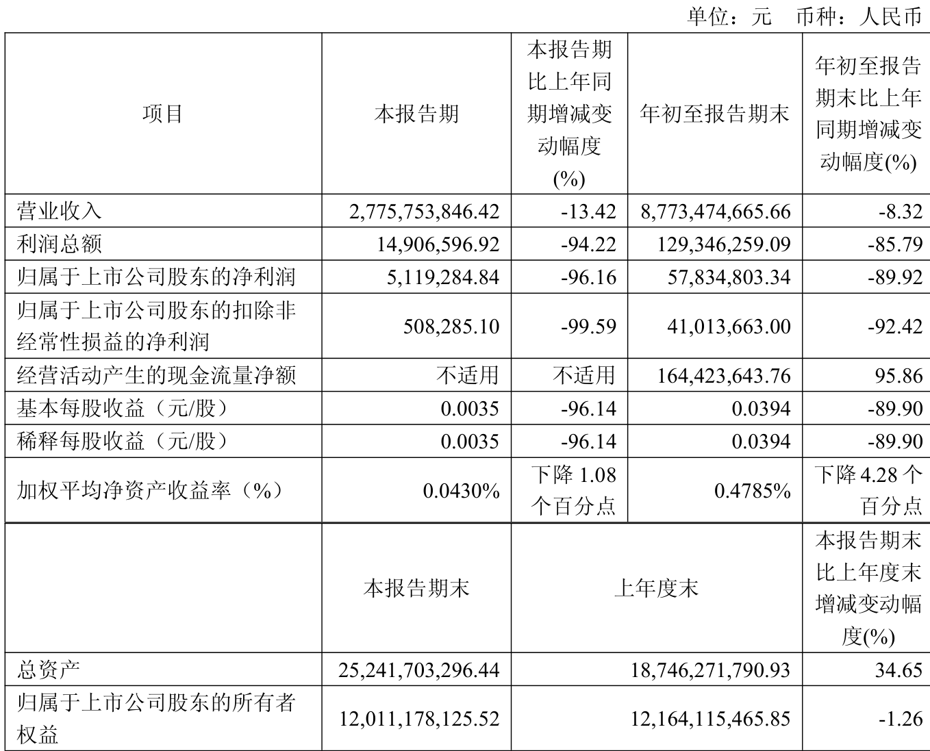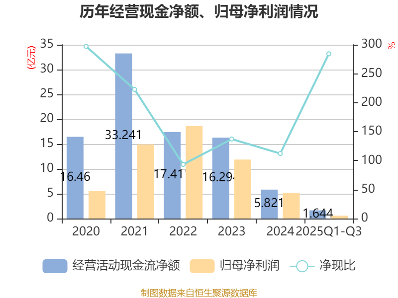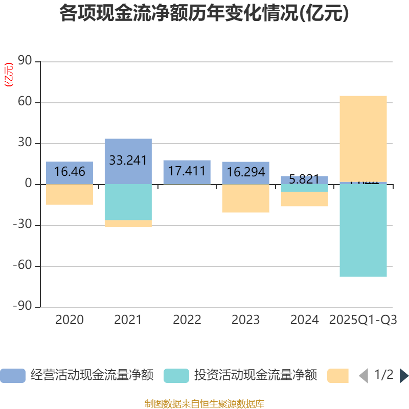 2025年前三季度,公司经营活动现金流净额为1.64亿元,同比增长95.86%;筹资活动现金流净额62.99亿元,同比增加67.29亿元;投资活动现金流净额-68亿元,上年同期为-7亿元。