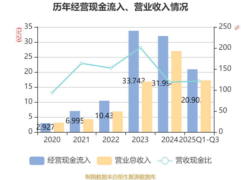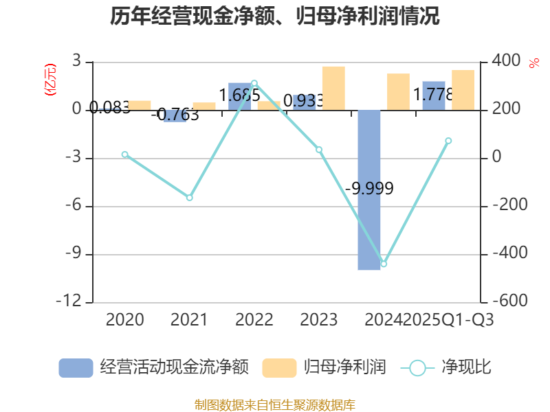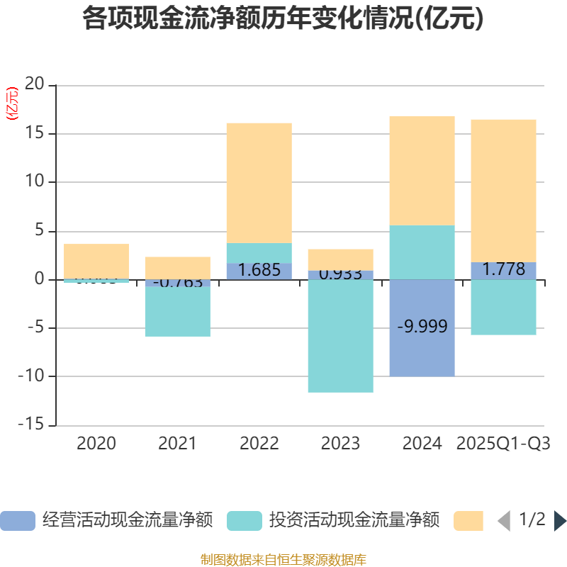 2025年前三季度,公司经营活动现金流净额为1.78亿元,同比增加11.69亿元;筹资活动现金流净额14.67亿元,同比增加3.9亿元;投资活动现金流净额-5.71亿元,上年同期为6.11亿元。