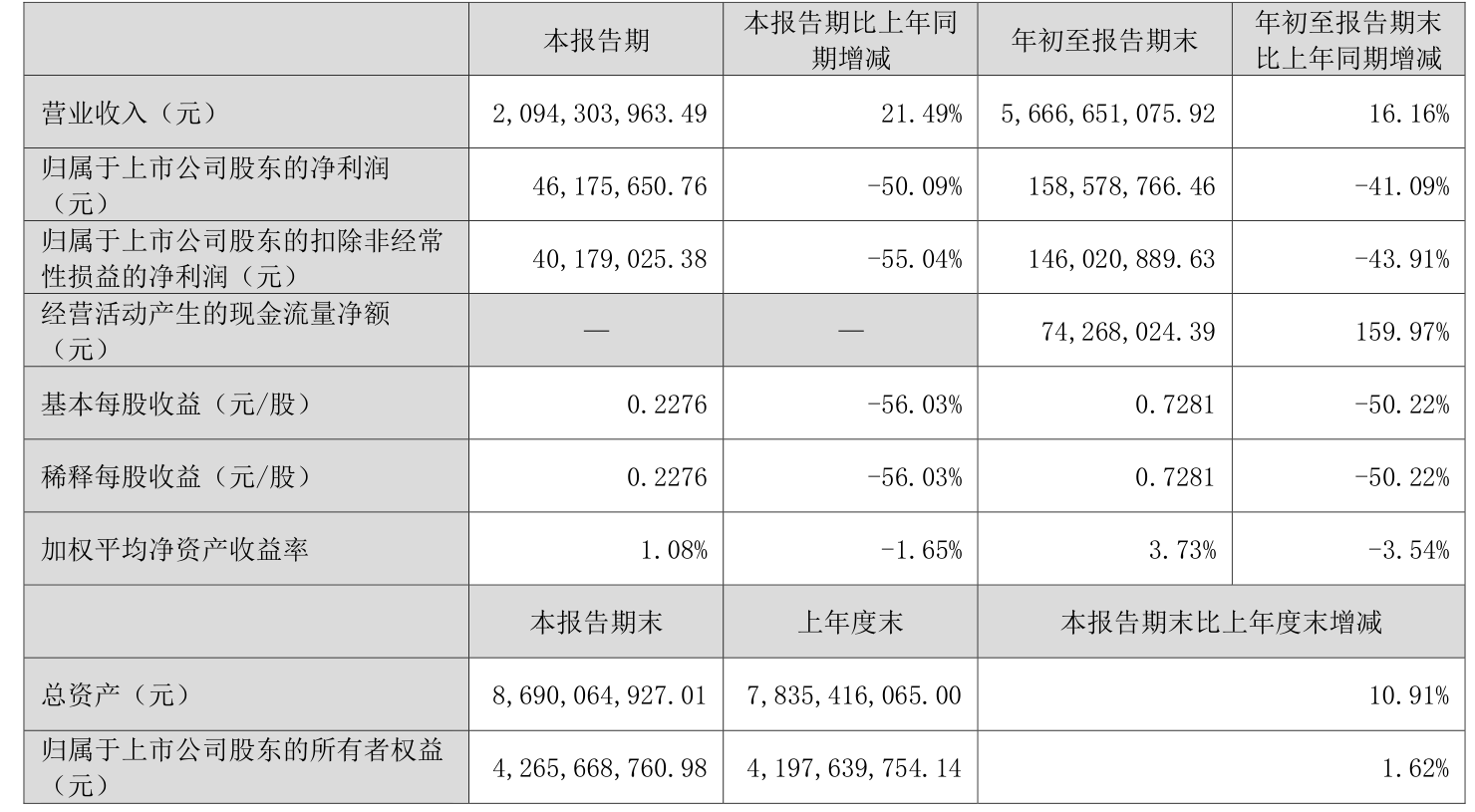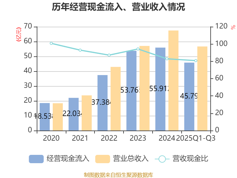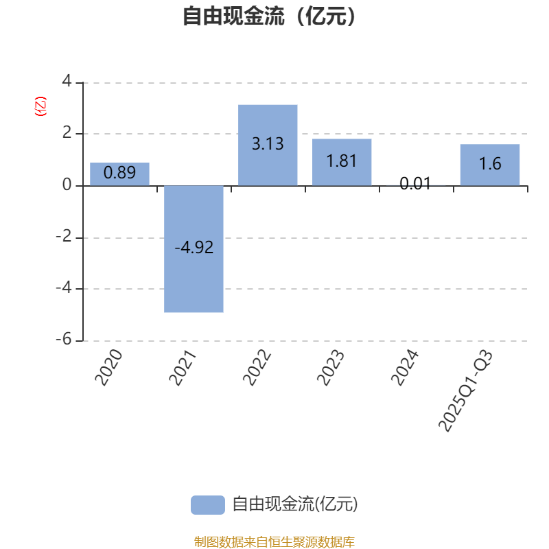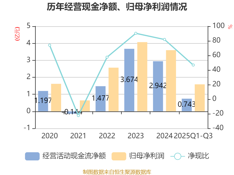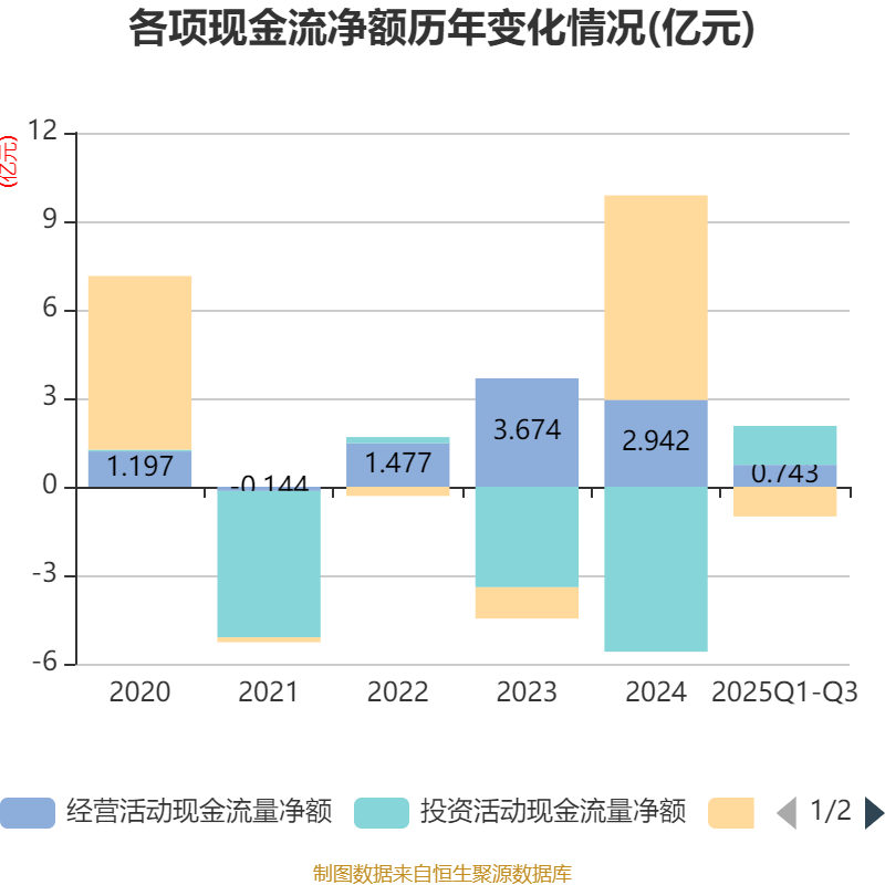 2025年前三季度,公司经营活动现金流净额为7426.8万元,同比增加1.98亿元;筹资活动现金流净额-1.01亿元,同比减少8.06亿元;投资活动现金流净额1.32亿元,上年同期为-2.47亿元。