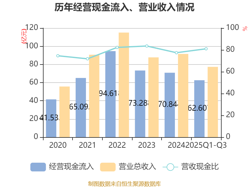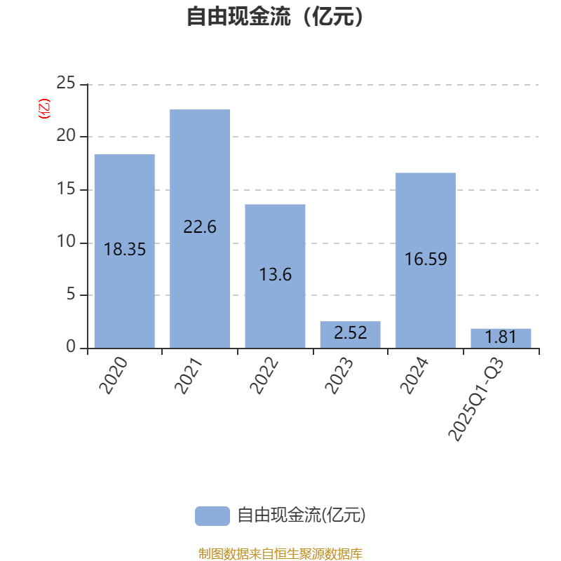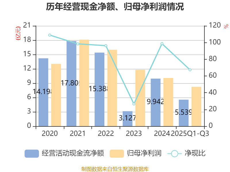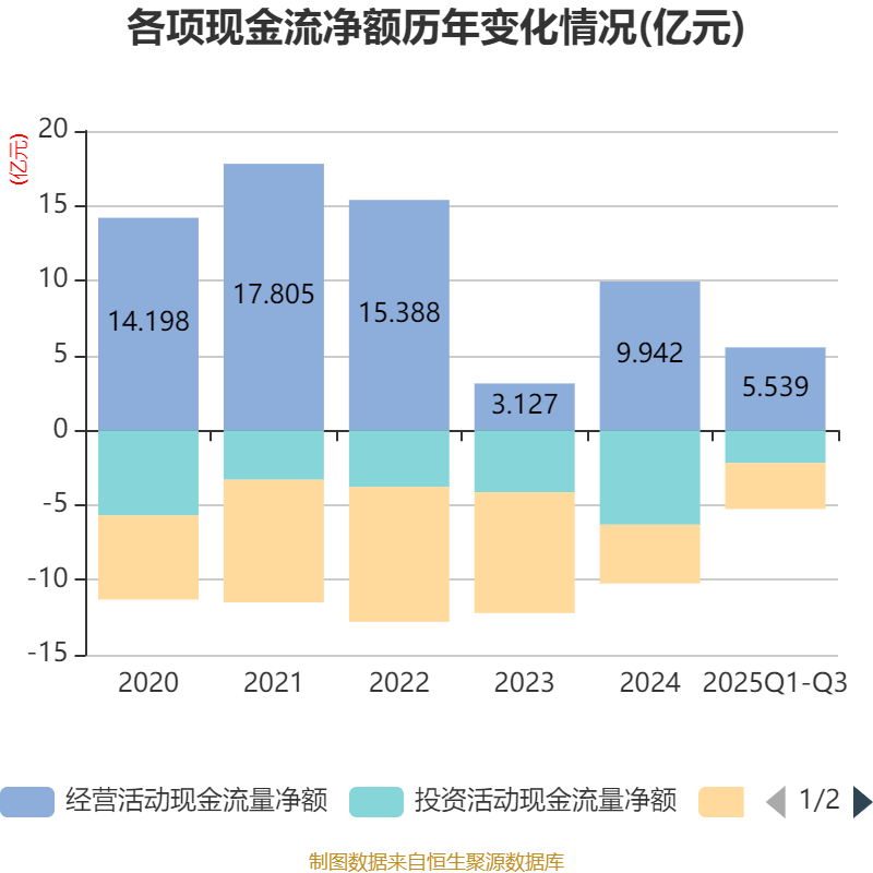 2025年前三季度,公司经营活动现金流净额为5.54亿元,同比下降40.82%;筹资活动现金流净额-3.06亿元,同比增加4.61亿元;投资活动现金流净额-2.19亿元,上年同期为-3.7亿元。