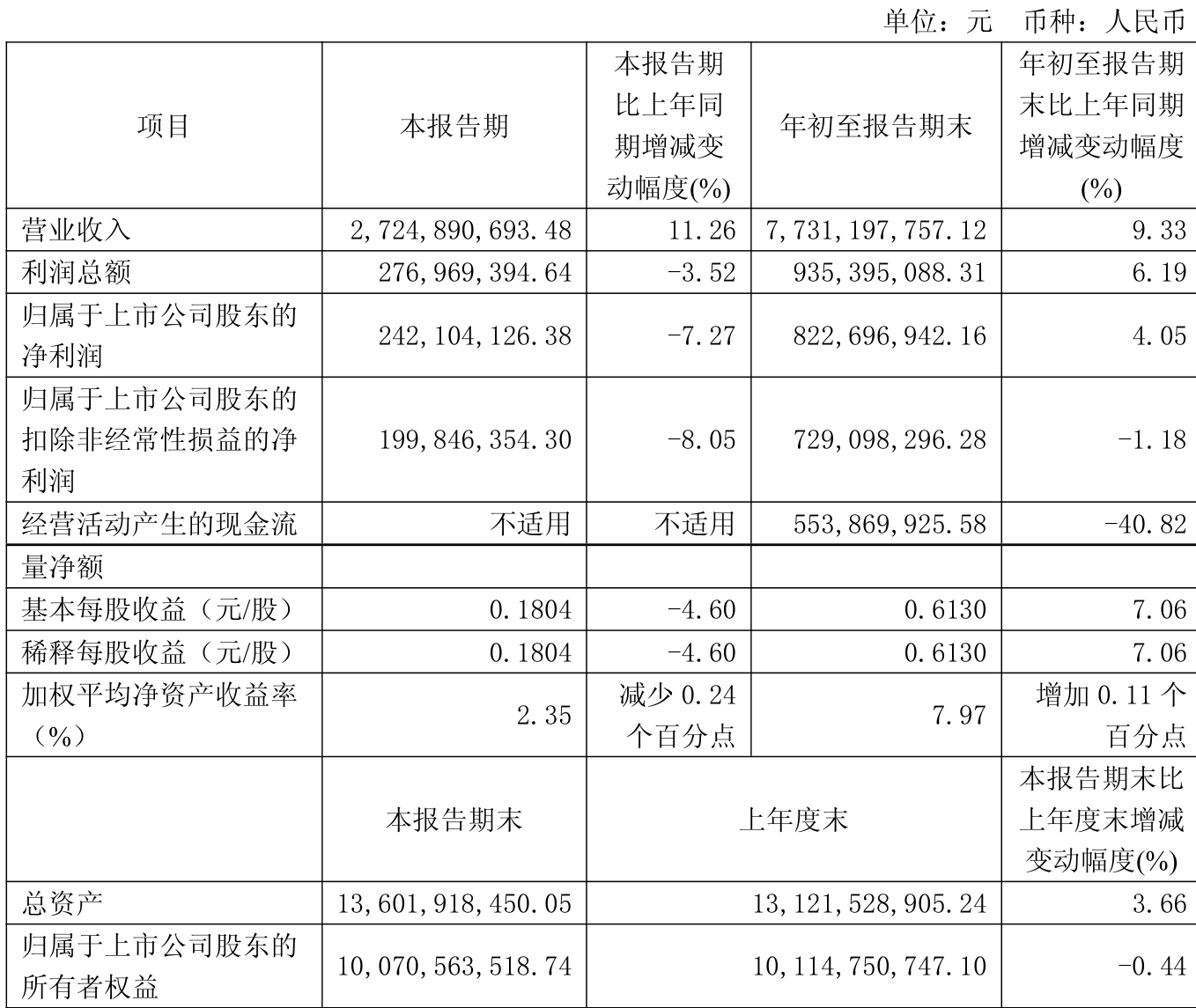 中证智能财讯嘉化能源(600273)10月30日披露2025年第三季度报告。前三季度公司实现营业总收入77.31亿元,同比增长9.33%;归母净利润8.23亿元,同比增长4.05%;扣非净利润7.29亿元,同比下降1.18%;经营活动产生的现金流量净额为5.54亿元,同比下降40.82%;报告期内,嘉化能源基本每股收益为0.613元,加权平均净资产收益率为7.97%。