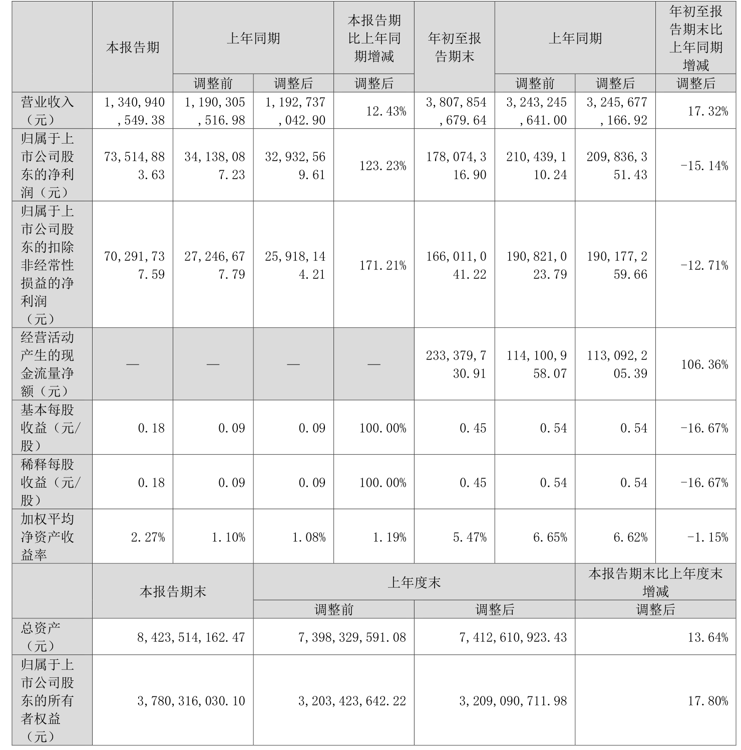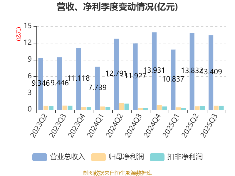 2025年前三季度,公司经营活动现金流净额为2.33亿元,同比增长106.36%;筹资活动现金流净额9.26亿元,同比增加2876.36万元;投资活动现金流净额-7.38亿元,上年同期为-9.48亿元。