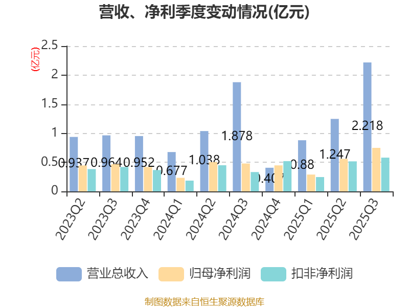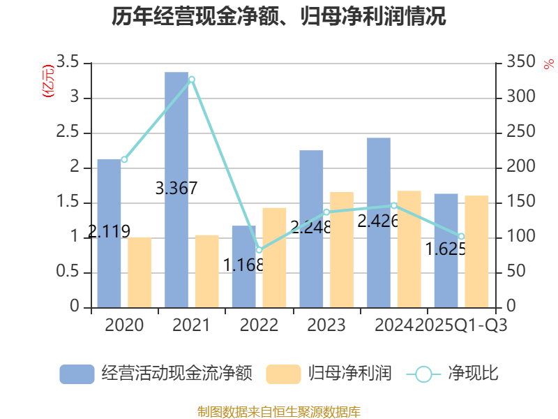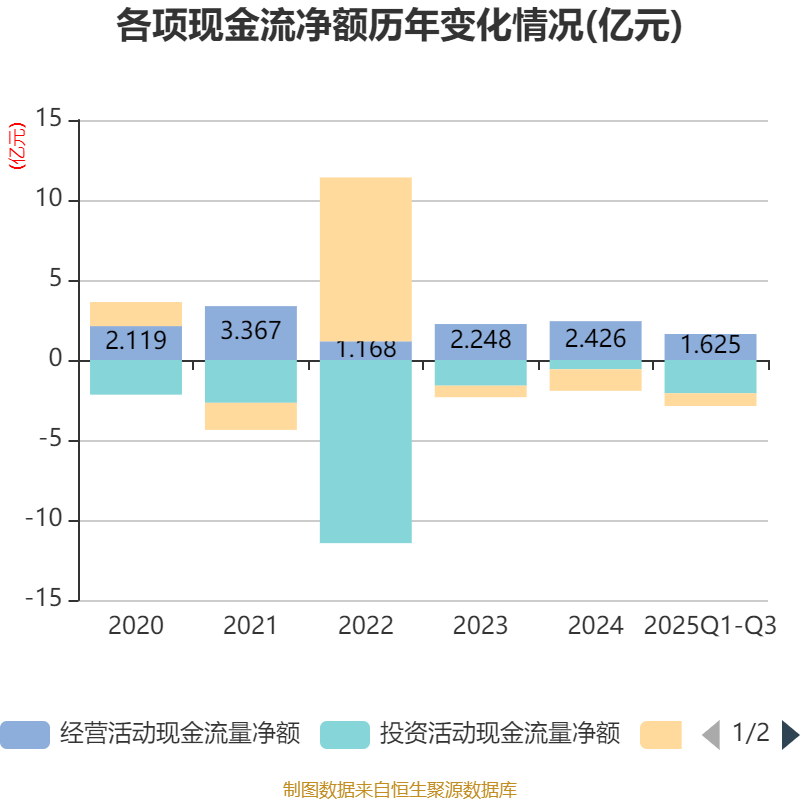 2025年前三季度,公司经营活动现金流净额为1.62亿元,同比增长73.6%;筹资活动现金流净额-7983.84万元,同比增加2115.4万元;投资活动现金流净额-2.08亿元,上年同期为5184.49万元。