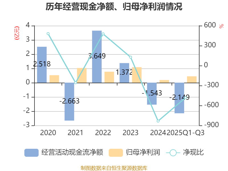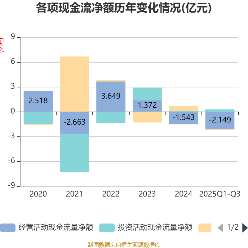 2025年前三季度,公司经营活动现金流净额为-2.15亿元,同比增加9588.77万元;筹资活动现金流净额-705.69万元,同比增加2611.06万元;投资活动现金流净额2695.73万元,上年同期为-1.97亿元。