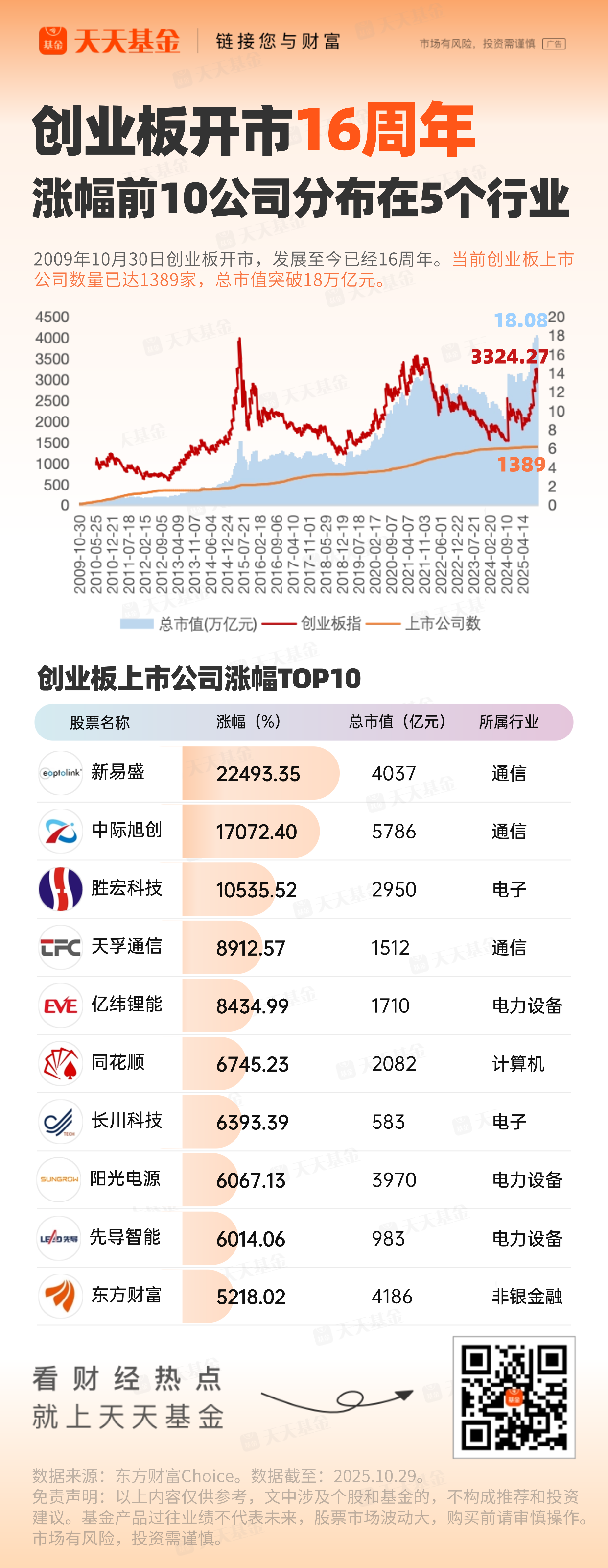 十六年间,创业板孕育了众多涨幅惊人的大牛股。自上市至今,新易盛以高达22493.35%的涨幅位居榜首,中际旭创紧随其后,累计涨幅达17072.40%。跻身涨幅前十的个股还包括胜宏科技、天孚通信、亿纬锂能、同花顺、长川科技、阳光电源、先导智能和东方财富,它们共同见证了创业板市场的成长与活力。