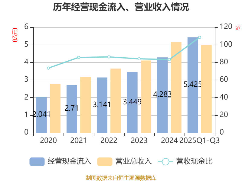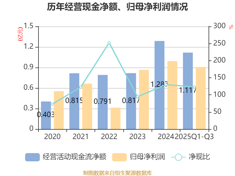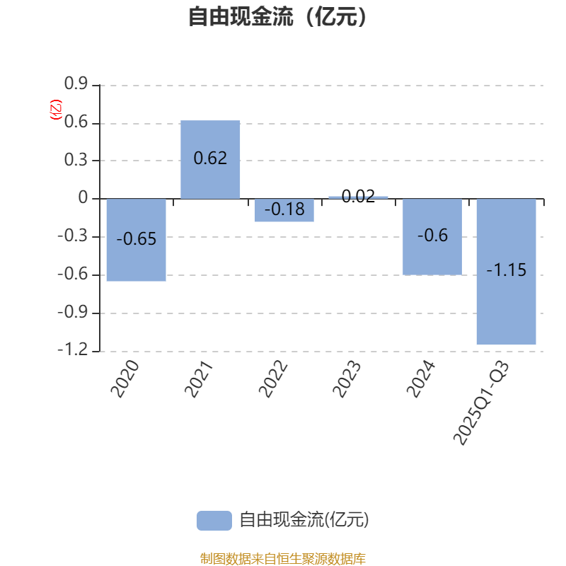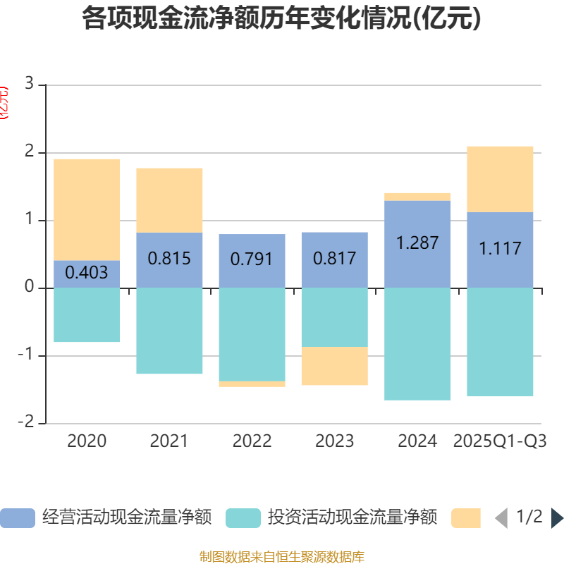 2025年前三季度,公司经营活动现金流净额为1.12亿元,同比增长35.17%;筹资活动现金流净额9703.85万元,同比增加9187.05万元;投资活动现金流净额-1.6亿元,上年同期为-1.08亿元。
