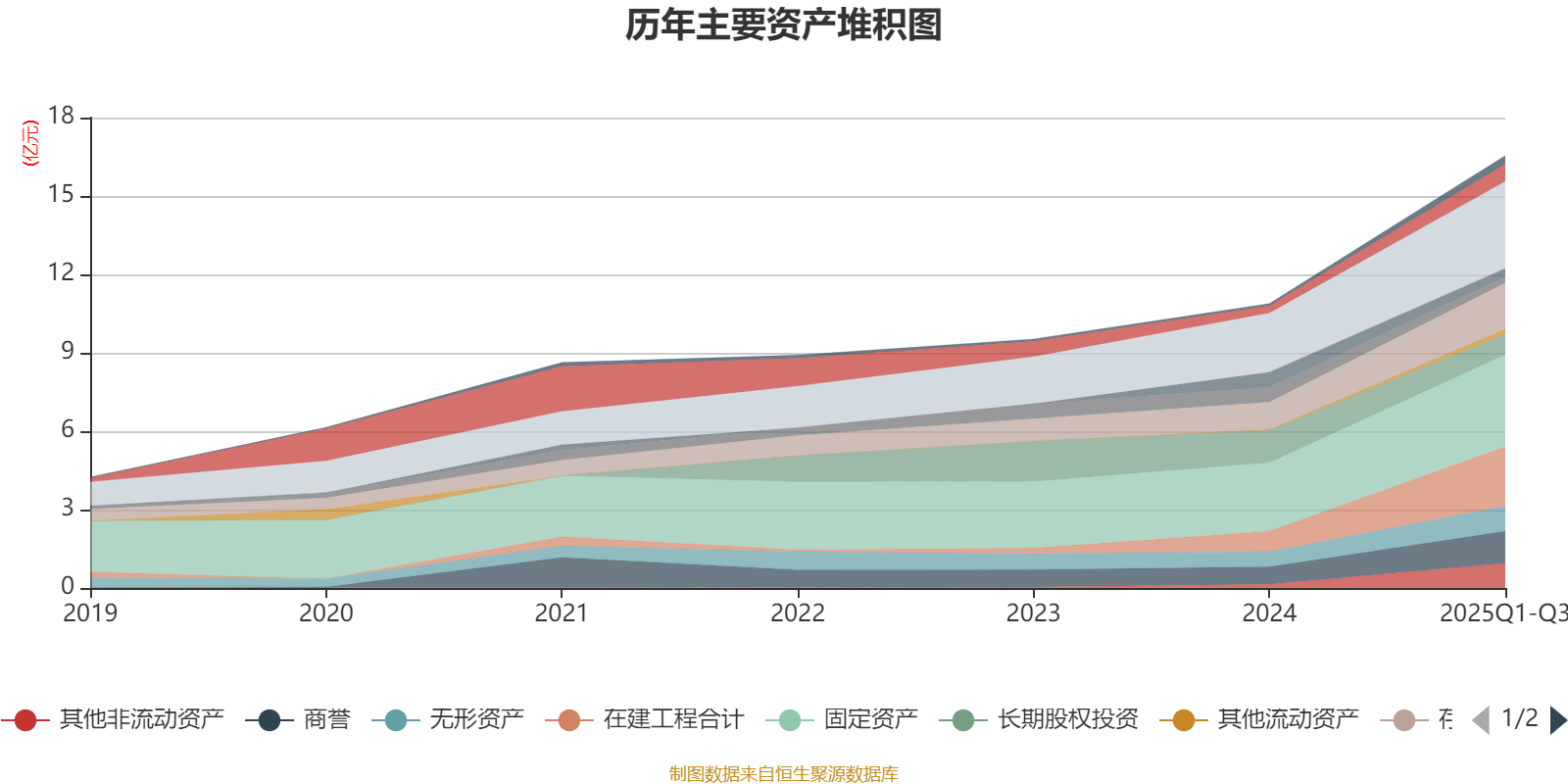 资产重大变化方面,截至2025年三季度末,公司长期股权投资较上年末减少36.82%,占公司总资产比重下降6.68个百分点;在建工程合计较上年末增加188.93%,占公司总资产比重上升6.49个百分点;其他非流动资产较上年末增加577.8%,占公司总资产比重上升4.43个百分点;应收款项融资较上年末减少59.62%,占公司总资产比重下降3.89个百分点。