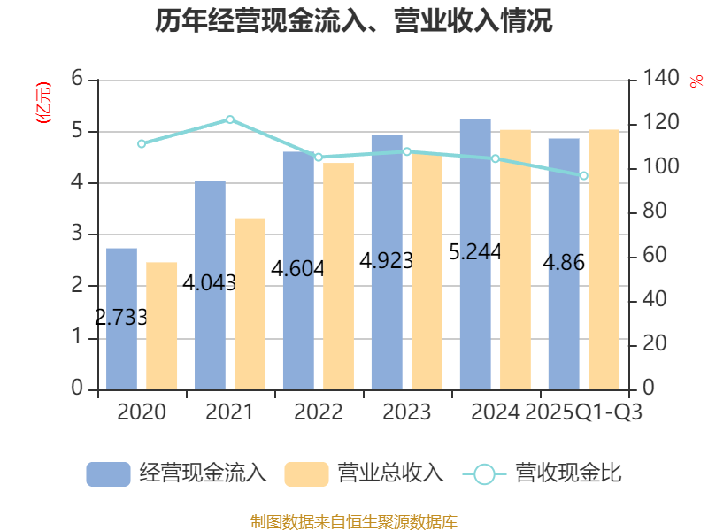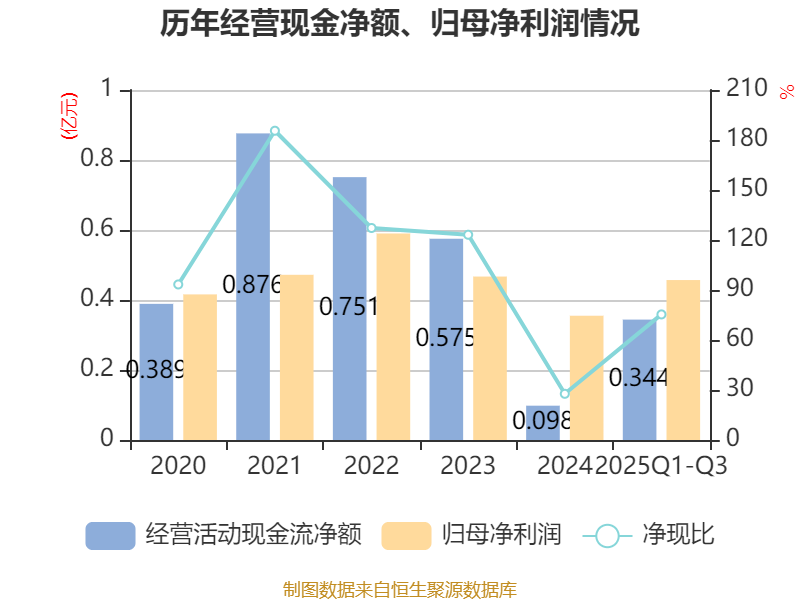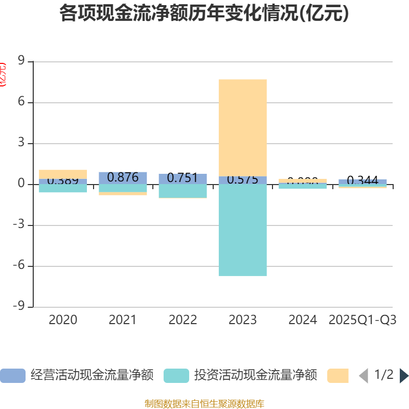 2025年前三季度,公司经营活动现金流净额为3443.07万元,同比增加7522.07万元;筹资活动现金流净额-978.92万元,同比减少6453.67万元;投资活动现金流净额-2037.76万元,上年同期为-3236.96万元。