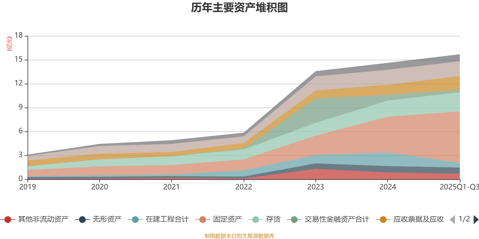 资产重大变化方面,截至2025年三季度末,公司固定资产较上年末增加43.04%,占公司总资产比重上升10.21个百分点;在建工程合计较上年末减少64.52%,占公司总资产比重下降7.81个百分点;交易性金融资产合计较上年末减少57.54%,占公司总资产比重下降2.93个百分点;应收票据及应收账款较上年末增加35.42%,占公司总资产比重上升2.27个百分点。