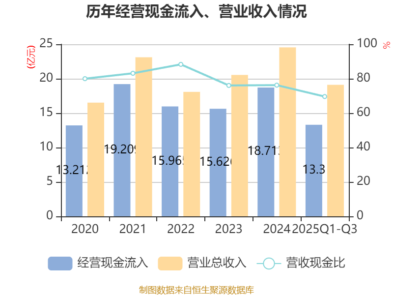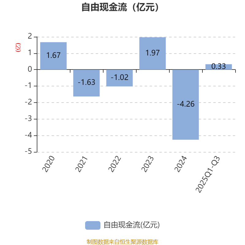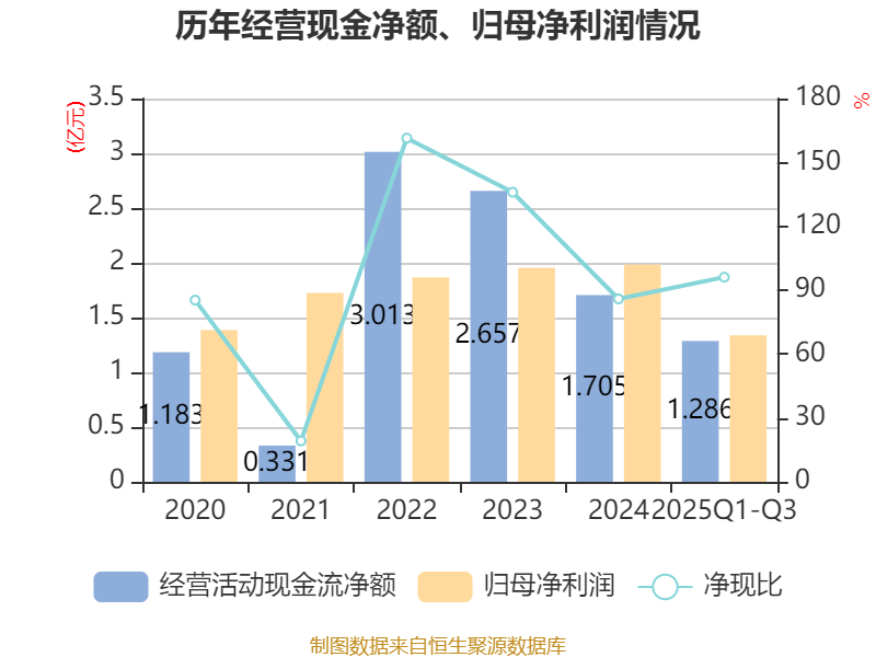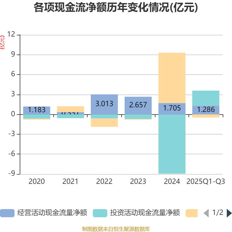 2025年前三季度,公司经营活动现金流净额为1.29亿元,同比增长21.57%;筹资活动现金流净额-4685.5万元,同比减少8.11亿元;投资活动现金流净额2.3亿元,上年同期为-6.04亿元。