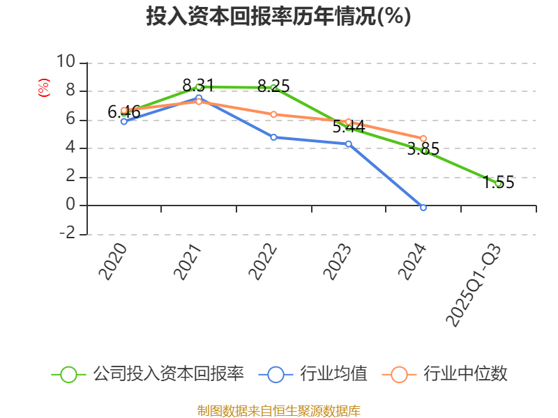 盈利能力方面, 2025年前三季度公司加权平均净资产收益率为1.35%,同比下降4.47个百分点。公司2025年前三季度投入资本回报率为1.55%,较上年同期下降2.89个百分点。