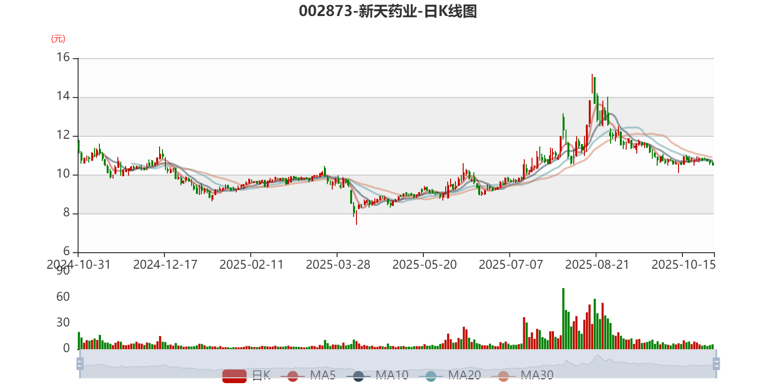 中证智能财讯新天药业(002873)10月31日披露2025年第三季度报告。前三季度公司实现营业总收入5.59亿元,同比下降15.47%;归母净利润1618.09万元,同比下降73.47%;扣非净利润1355.45万元,同比下降67.93%;经营活动产生的现金流量净额为1.16亿元,同比增长112.07%;报告期内,新天药业基本每股收益为0.0663元,加权平均净资产收益率为1.35%。