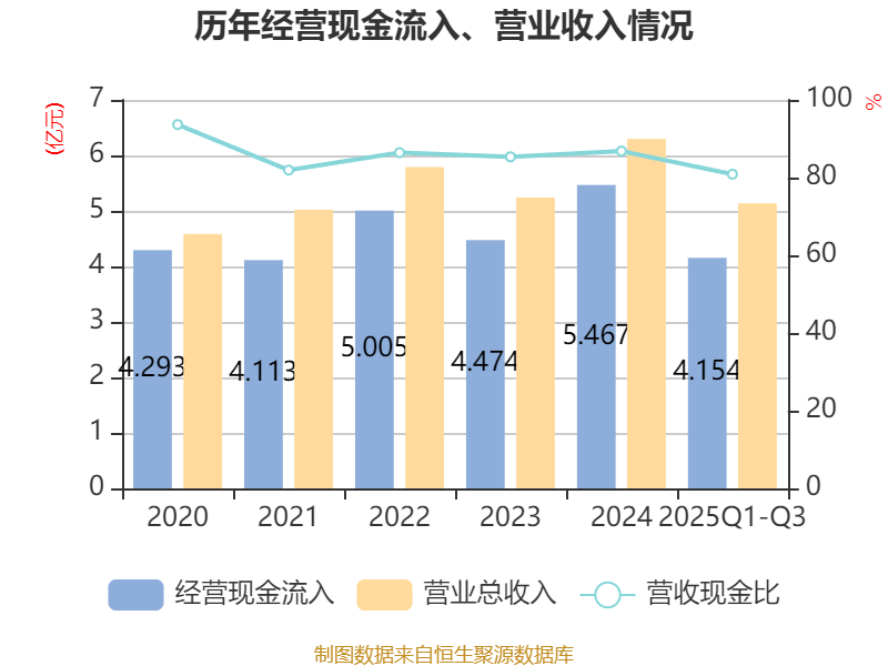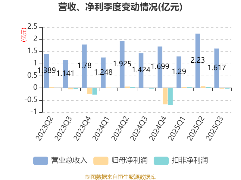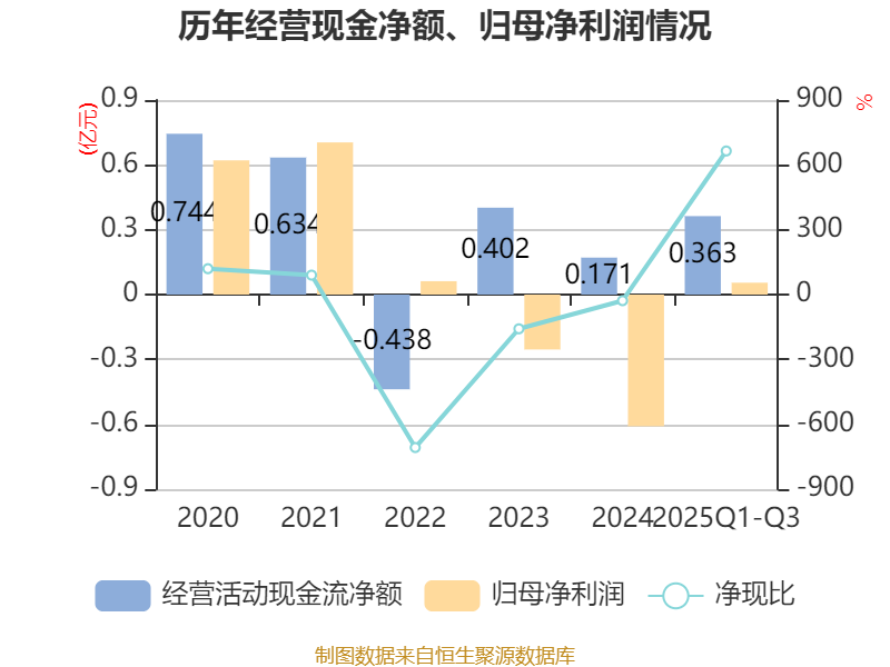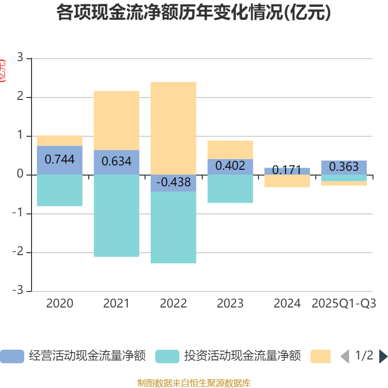 2025年前三季度,公司经营活动现金流净额为3633.59万元,同比下降7.38%;筹资活动现金流净额-1134.95万元,同比减少3924.01万元;投资活动现金流净额-1729.24万元,上年同期为444.06万元。