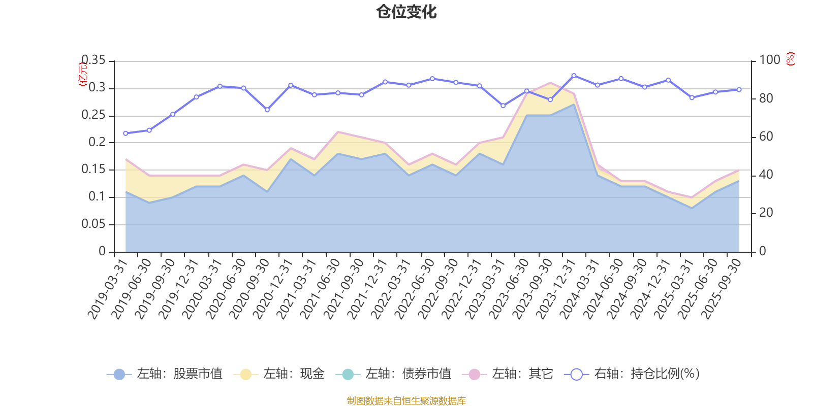 据定期报告数据统计,近三年平均股票仓位为85.3%,同类平均为72.35%。2023年末基金达到92.3%的最高仓位,2019年一季度末最低,为62.08%。