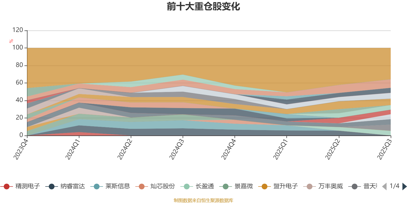 截至2025年三季度末,基金十大重仓股分别是国博电子、源杰科技、普天科技、经纬恒润、沃格光电、龙旗科技、铂力特、长盈通、中国海防、中科海讯。