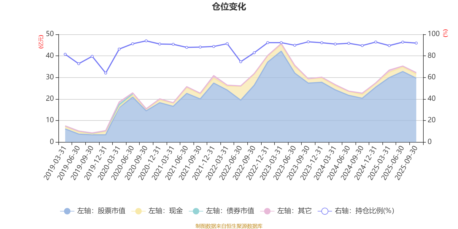据定期报告数据统计,近三年平均股票仓位为91.6%,同类平均为72.35%。2020年三季度末基金达到93.97%的最高仓位,2019年末最低,为64.09%。