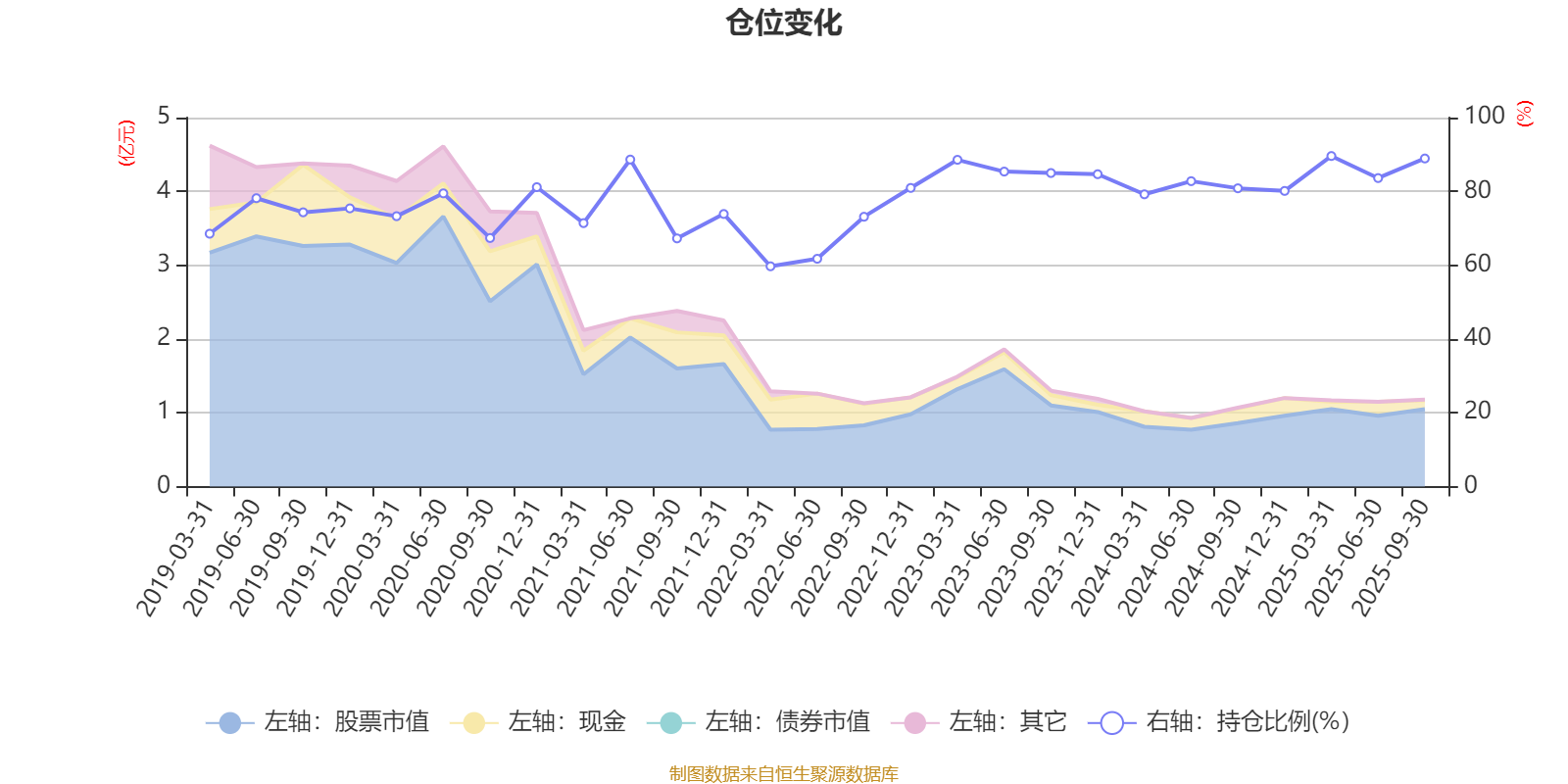 据定期报告数据统计,近三年平均股票仓位为84.13%,同类平均为72.35%。2025年一季度末基金达到89.59%的最高仓位,2022年一季度末最低,为59.7%。