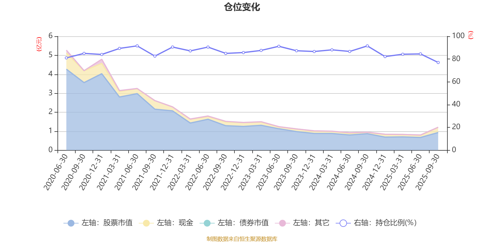据定期报告数据统计,近三年平均股票仓位为86.07%,同类平均为83.73%。2021年上半年末基金达到91.6%的最高仓位,2025年三季度末最低,为77.01%。