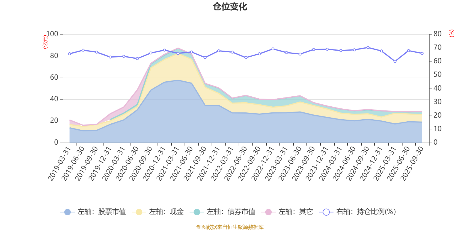 据定期报告数据统计,近三年平均股票仓位为67.41%,同类平均为67.37%。2024年三季度末基金达到70.39%的最高仓位,2025年一季度末最低,为60.18%。