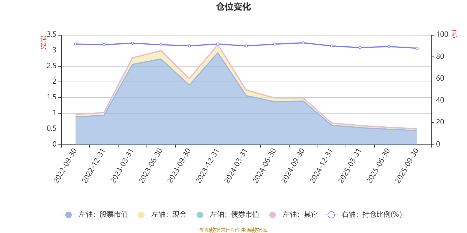 据定期报告数据统计,近三年平均股票仓位为90.56%,同类平均为83.73%。2024年三季度末基金达到92.81%的最高仓位,2025年三季度末最低,为87.92%。