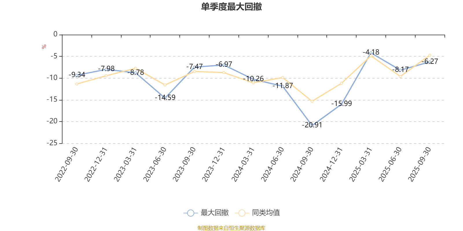 截至10月29日,基金近三年最大回撤为29.84%,同类可比基金排名15/29。单季度最大回撤出现在2024年三季度,为20.91%。