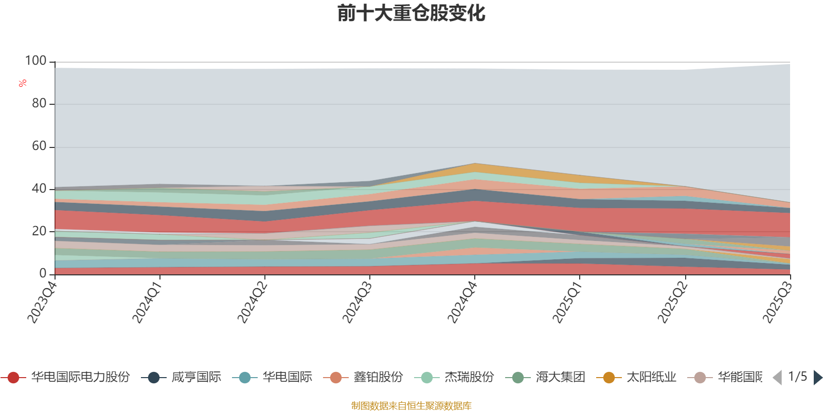 且持股标的较为稳定。截至2025年三季度末,基金十大重仓股分别是润丰股份、英科医疗、大唐发电、华能国际电力股份、华电国际电力股份、咸亨国际、江河集团、太阳纸业、兔宝宝、建设银行。