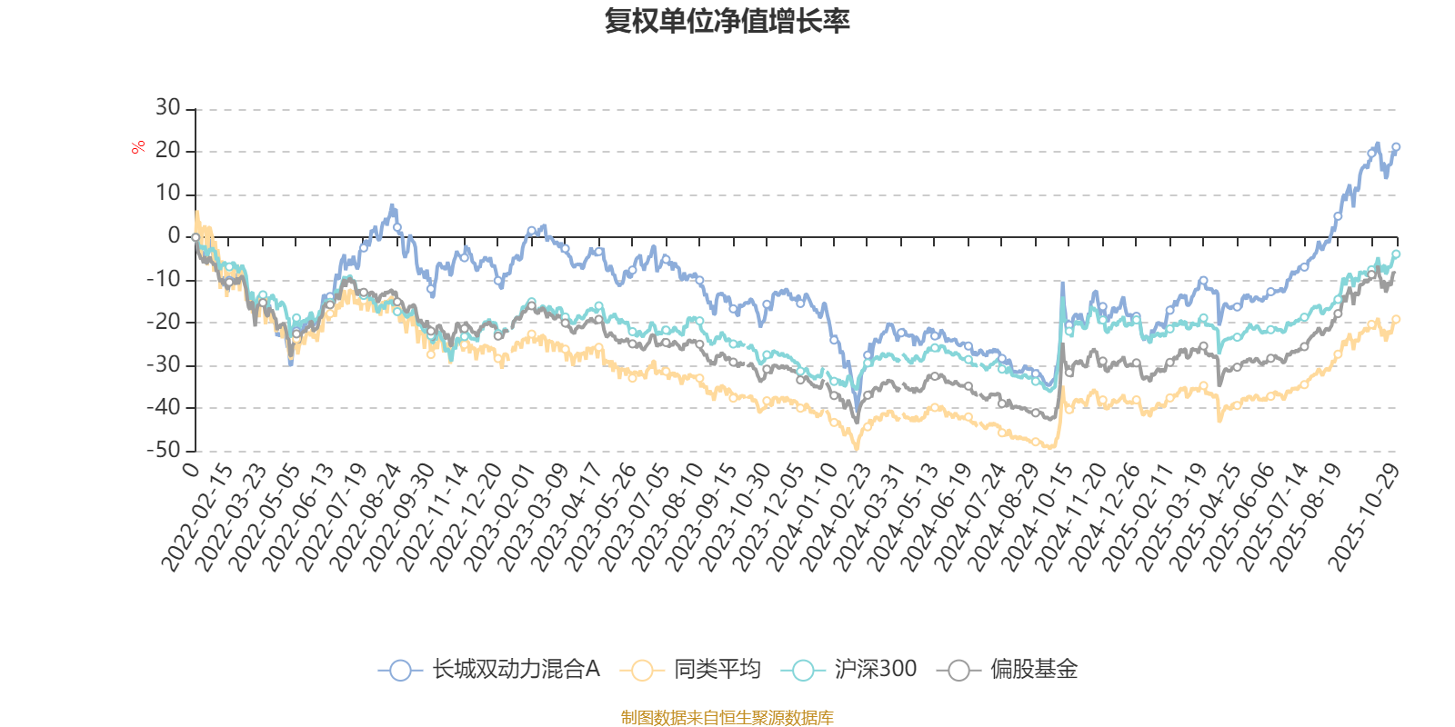 截至10月29日,长城双动力混合A近三个月复权单位净值增长率为22.21%,位于同类可比基金163/621;近半年复权单位净值增长率为44.86%,位于同类可比基金125/621;近一年复权单位净值增长率为49.98%,位于同类可比基金125/611;近三年复权单位净值增长率为33.11%,位于同类可比基金162/518。