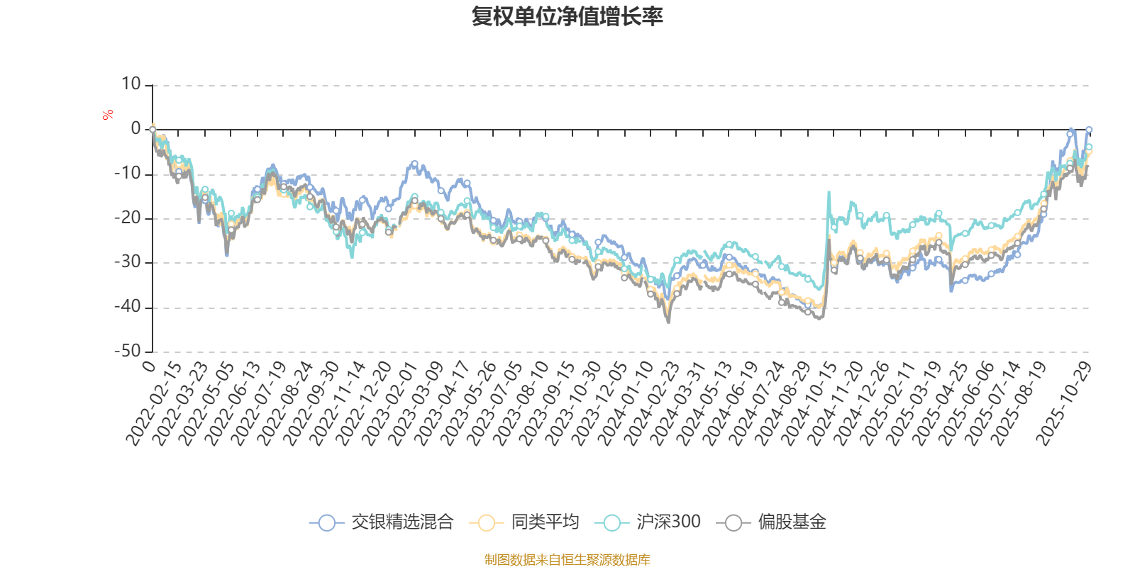 截至10月29日,交银精选混合近三个月复权单位净值增长率为31.48%,位于同类可比基金19/130;近半年复权单位净值增长率为50.93%,位于同类可比基金23/130;近一年复权单位净值增长率为40.68%,位于同类可比基金42/130;近三年复权单位净值增长率为25.55%,位于同类可比基金62/124。