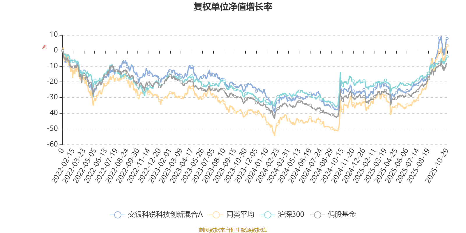 截至10月29日,交银科锐科技创新混合A近三个月复权单位净值增长率为30.35%,位于同类可比基金135/229;近半年复权单位净值增长率为47.92%,位于同类可比基金128/229;近一年复权单位净值增长率为44.26%,位于同类可比基金154/213;近三年复权单位净值增长率为29.17%,位于同类可比基金116/158。