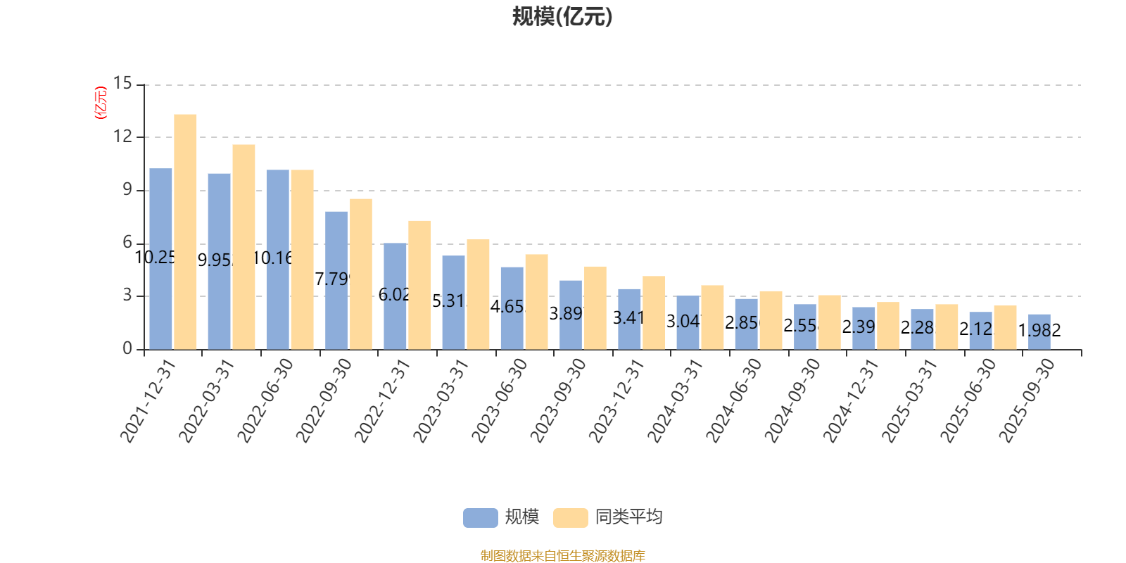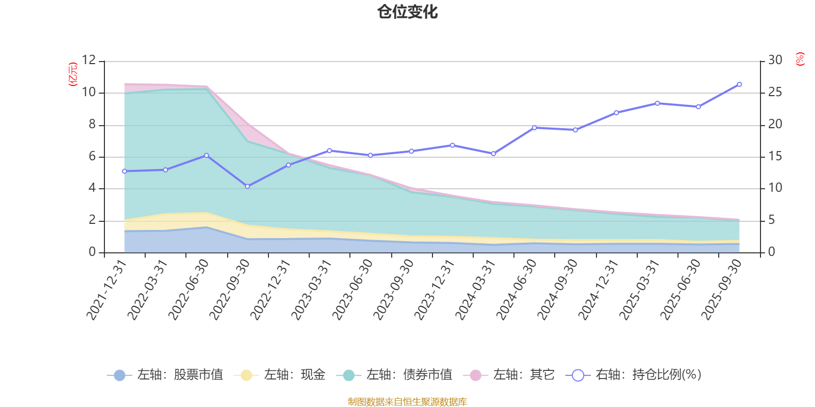 据定期报告数据统计,近三年平均股票仓位为18.87%,同类平均为19.14%。2025年三季度末基金达到26.35%的最高仓位,2022年三季度末最低,为10.37%。