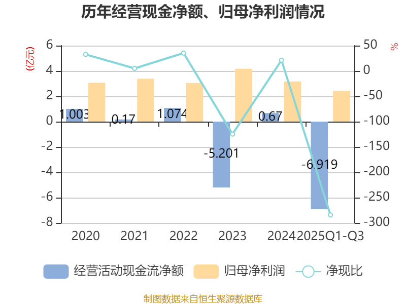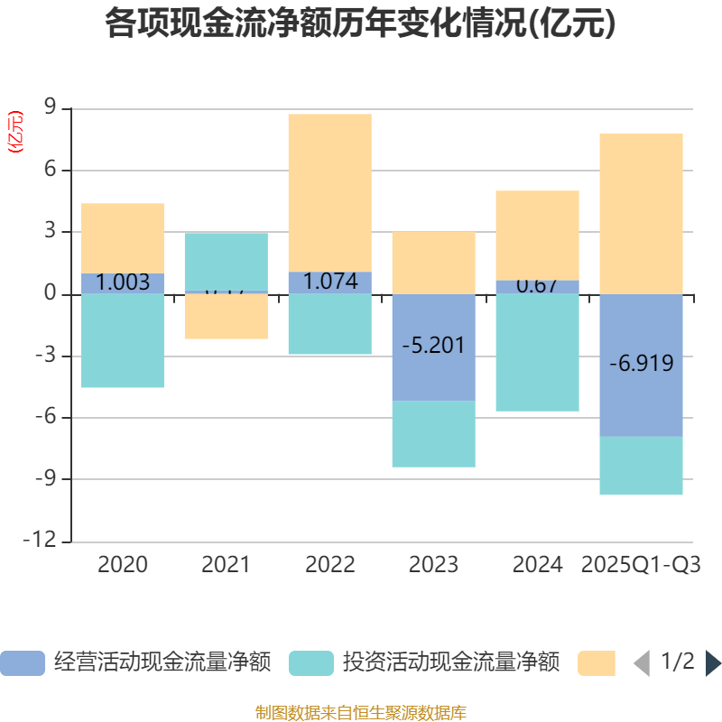 2025年前三季度,公司经营活动现金流净额为-6.92亿元,同比减少4.35亿元;筹资活动现金流净额7.78亿元,同比增加3.73亿元;投资活动现金流净额-2.81亿元,上年同期为-3.61亿元。