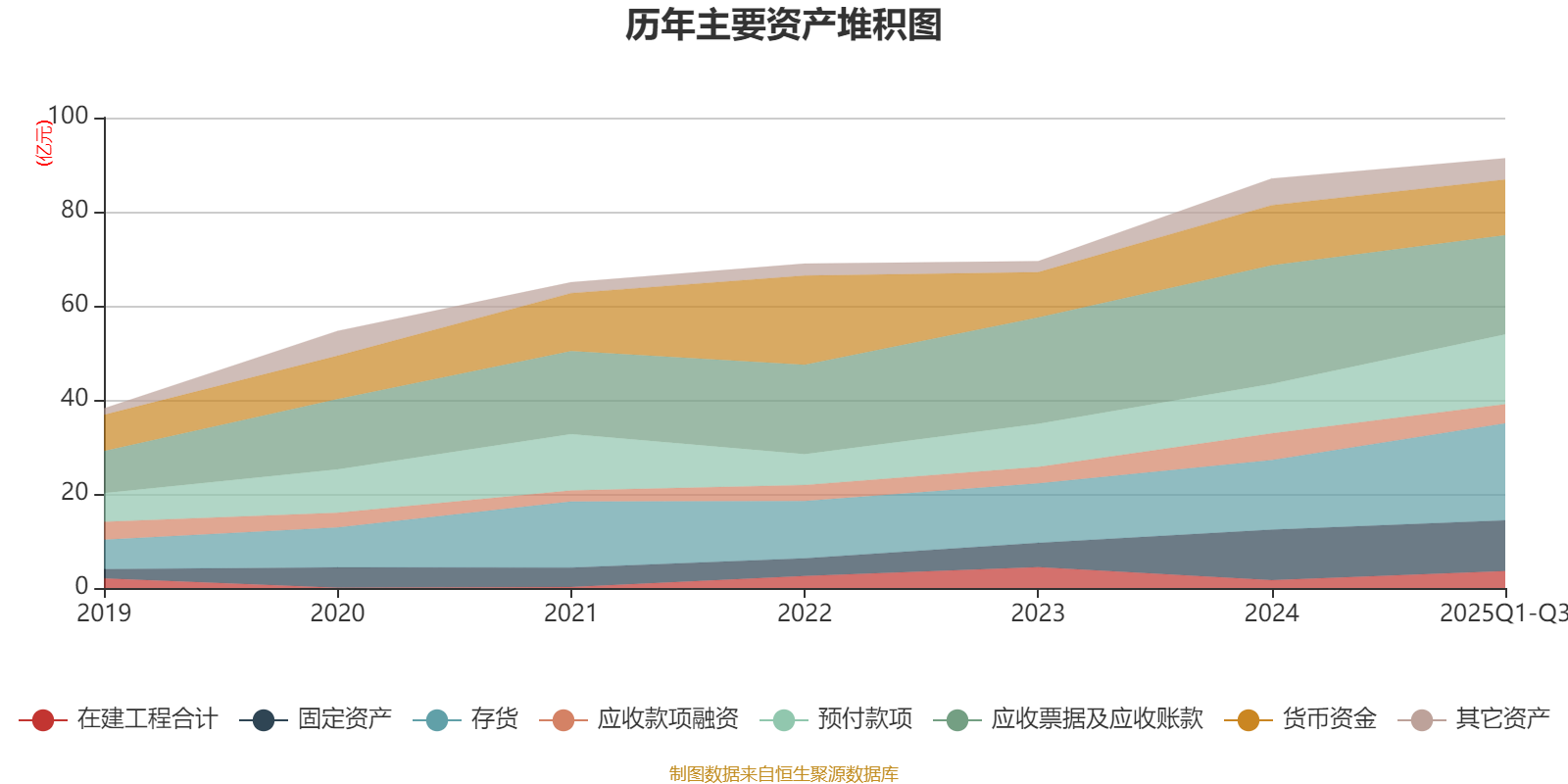 资产重大变化方面,截至2025年三季度末,公司应收票据及应收账款较上年末减少16.54%,占公司总资产比重下降5.94个百分点;存货较上年末增加39.18%,占公司总资产比重上升5.56个百分点;预付款项较上年末增加41.4%,占公司总资产比重上升4.19个百分点;应收款项融资较上年末减少28.26%,占公司总资产比重下降2.06个百分点。